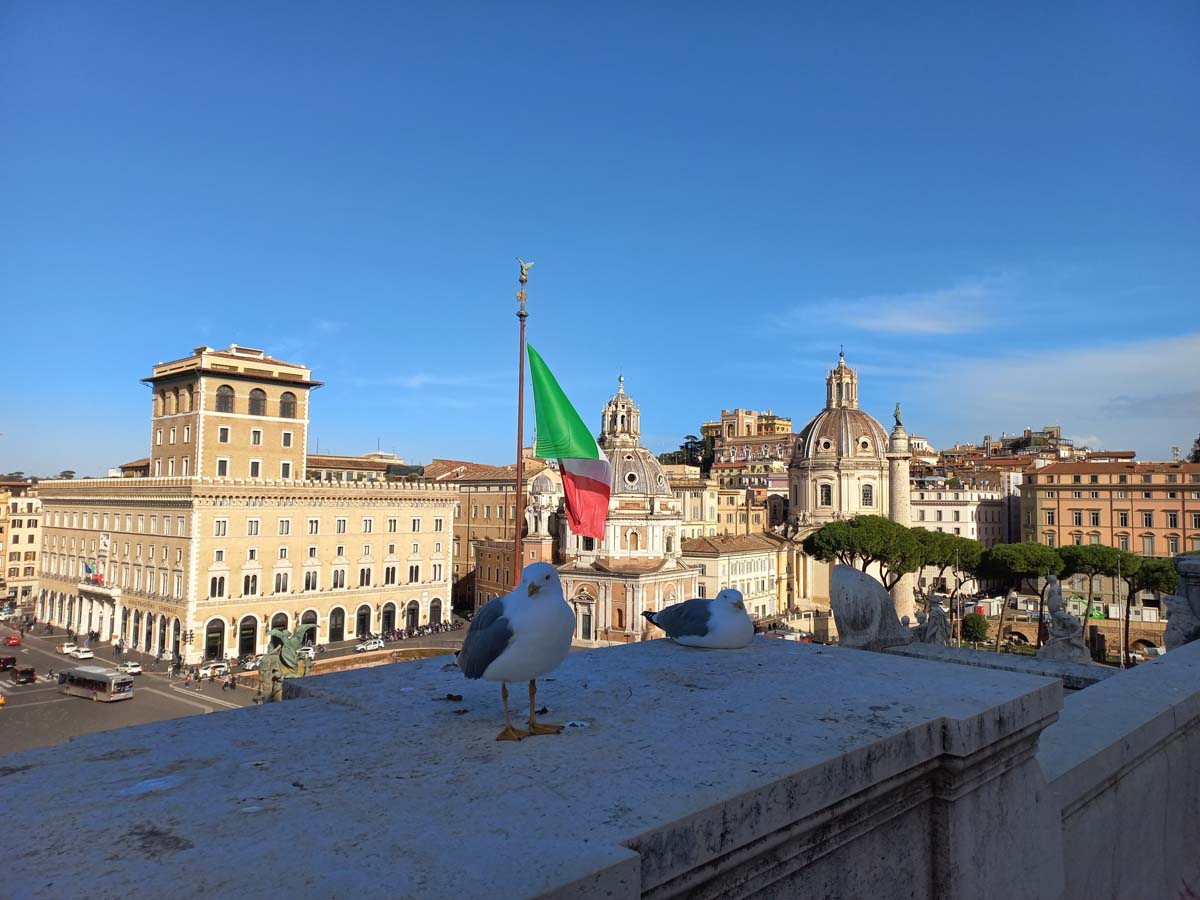Одна з відмінностей римського регіону від неапольського — тут нажаль немає такого повального стрітфуду. Рівень піци у крові значно впав, ми вже були майже добу без піци. Вона тут просто на вулицях не продається, чи нам так не щастило всі три дні. Хоча стрітфуд дуже важливий у подорожах, це банальна економія часу вдень. Зате ось хто себе дійсно відчував вільно у плані їжі, це римські чайки. Вони тут буквально найкращі друзі людей. Коли ти підходиш до чергового оглядового балкончика десь у місті, на перилах неодмінно на тебе чекатиме з гордим виглядом чайка.