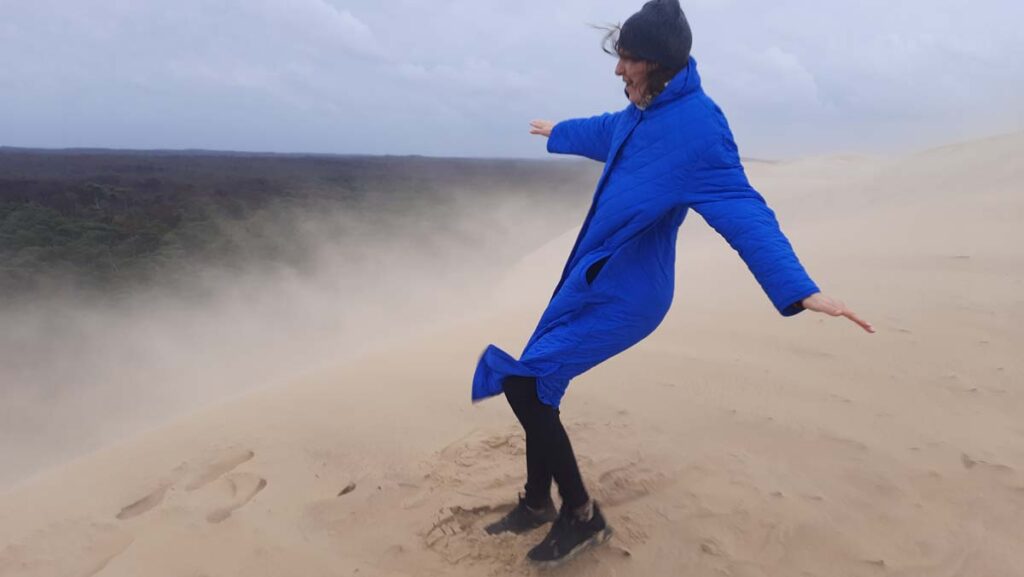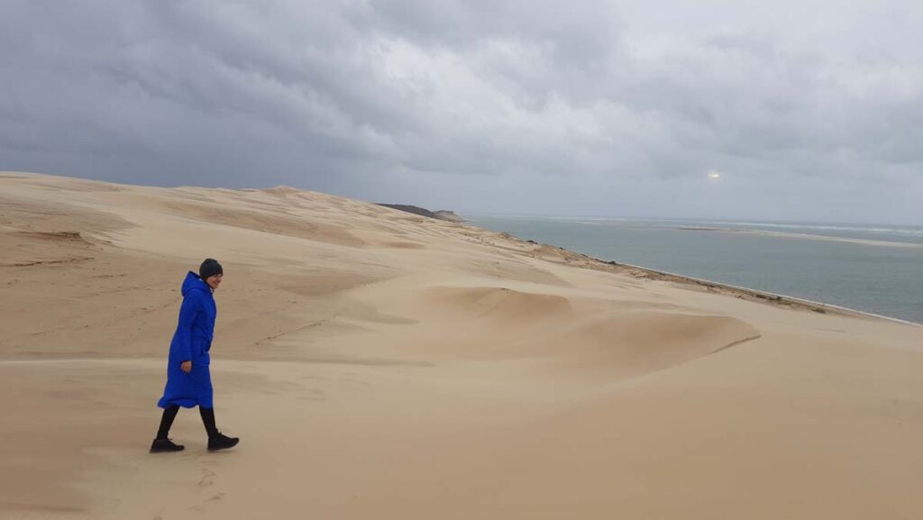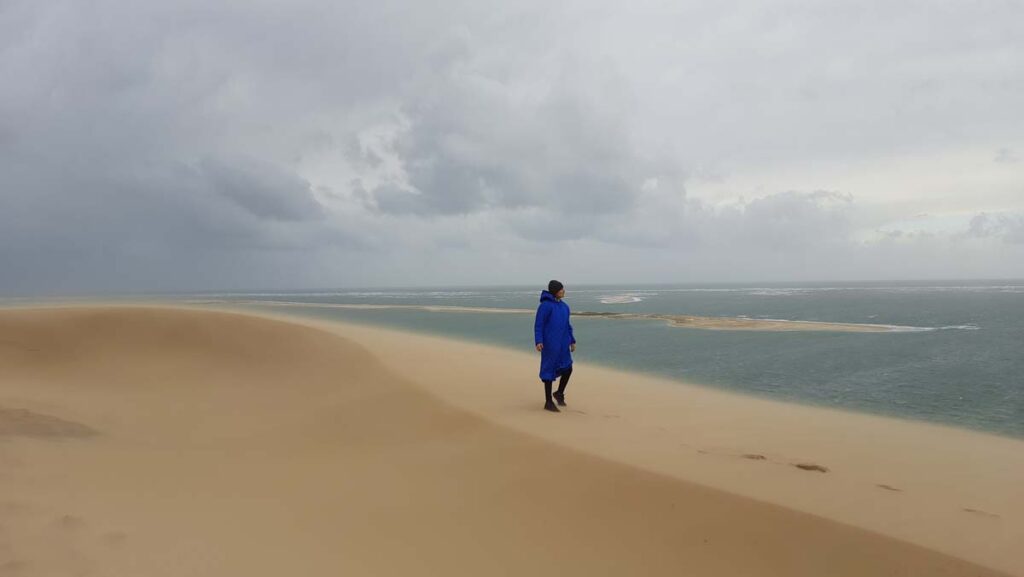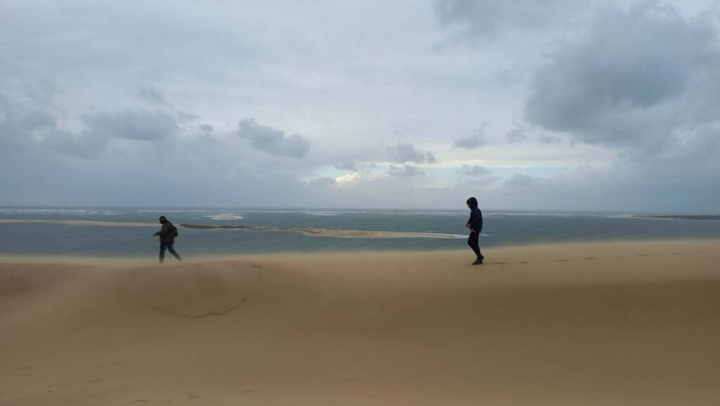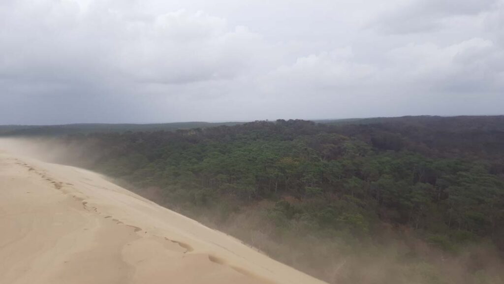 Завдяки нам він дізнався розклад і номер автобуса туди і назад. Він був дуже радий, що зустрів нас. До речі, у Бордо по прильоту я взагалі зміг проконсультувати француженку французькою мовою як їй дістатись до центра. Цікаво, що ми вже п’ятий раз у Франції і деякі важливі туристичні слова вивчились самі собою. Ми приїхали до дюни Піла. Моя вам рекомендація – для поїздки за можливості обирайте максимально вітряну погоду – отримаєте цікавий, незабутній і екстремальний досвід. Тут знаходиться величезна дюна, вона настільки велика, що верхівки дерев десь далеко внизу.