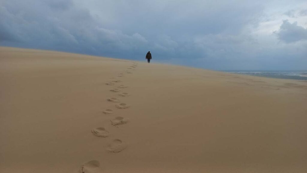 Усі кишені та взуття забивалися піском так, що час від часу потрібно було його висипати. Гул у вухах стояв такий, що я здивувався як уночі не було дзвону. Які б глибокі сліди ми не залишали, десь за 5 хвилин їх замітало повністю. Я дуже-дуже раджу спробувати для себе відкрити такий вид розваги, як буря в пустелі. Якщо вам не пощастило і ви сюди потрапили у хорошу погоду, то кажуть тут красиві заходи сонця. Але у нашому випадку ми це перевірити не змогли. Тепер 40 хвилин на автобусі і ми знову в Аркашоні.