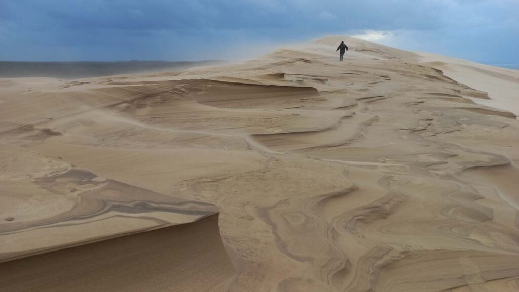 Чим більше ми піднімались до верху, тим сильніше усвідомлювали наскільки зараз почнеться цікава пригода. І ось ми на вершині. Вітер тут був настільки жорстоким, що час від часу ми хапались за обличчя від болю врізання піщинок. Види тут неймовірні, на краю дюни дуже екстремально і, схоже, не дуже безпечно. Довжина маршруту по вершині десь година в один бік. І дійсно було круто, що ми потрапили в епіцентр стихії.
