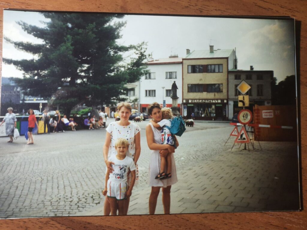 В подорож нас зібралось четверо: мама, шестирічний я і трьохрічний Саша зі своєю мамою. Пам’ятаю як під час дороги на вокзал автомобіль проскочив поміж двома трамваями, що їхали один одному на зустріч. Це були лихі дев’яності і таке водіння здавалося нашому знайомому “крутим”. Але мама ще тоді пояснила мені, що він з’їхав з глузду. Потім ми сіли у потяг і їхали до Ужгорода. Під час подорожі пам’ятаю, як ми з Сашком ділили горішки в глазурі, та так, що розсипали їх на постіль. Взагалі ми відправлялись в тур до Словаччини, але під час подорожі нам повідомили що ми їдемо до Чехії. Ще пам’ятаю, коли потяг рушив з місця, я другові розповідав, що насправді то земля за вікном рушила, а не ми. Потім я пам’ятаю, як ми перетинали на автобусі кордон. Мене покликав офіцер по імені, від чого я прокинувся. Нас, туристів, був цілий автобус. Були дві дорослі подружки-підлітки. Вони на кордоні з дерев зривали якісь диковинні плоди схожі на стручки квасолі. Потім ми проїжджали глиняного кольору ріку і якийсь замок на горі. Зараз мені спогади малюють невеликий, але справжній лицарський замок. Хоча я думаю, там було щось трохи простіше.