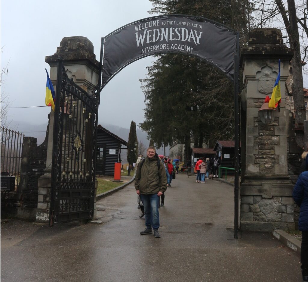 Варто зазначити, що без Даші грати у гру “Хто перший побачить замок” не так цікаво. Це як Альф колись сказав, що не так приємно самому собі цьомати пальчика. Наскільки мені розповіли місцеві колеги, то Невермор знімали тільки ззовні, тож в середину самого замку заходити не обов’язково. І ось я, як учень академії, гуляю по кампусу. В різних місцях замку розташовані банери з фотографіями, яка саме сцена знімалася в цьому місці. Якщо після Пелішу я був дуже щасливий, то тепер я був вдвічі дуже щасливий.
