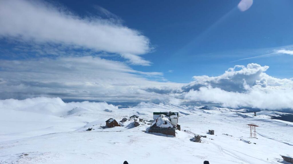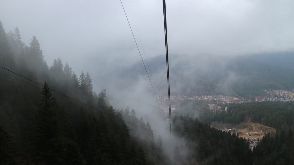Доки йшов від замку до міста, почали розходитися густі хмари і відкрилися колосально круті гори. О, мені туди! Тільки спочатку на каву з брауні. В цей момент настав мій рекорд по кроках, на годиннику була перша година дня, а я вже зробив 20 000 кроків. Рекорд це класно, але я знаю що у мене залишилося максимум 14 000, після цього я точно знаю, що ноги відваляться, це моя межа. Тож тепер треба економити ці самі кроки)))) На щастя з економією кроків мені допомогла канатна дорога, що працює раз на пів години, тож у мене був півгодинний відпочинок у примусовому форматі. Не сказав би, що я був проти. А ось і вагончик, вйо до вершини на 2270 метрів. Хмари ставали все ближче і ближче, потім стало зовсім біло.