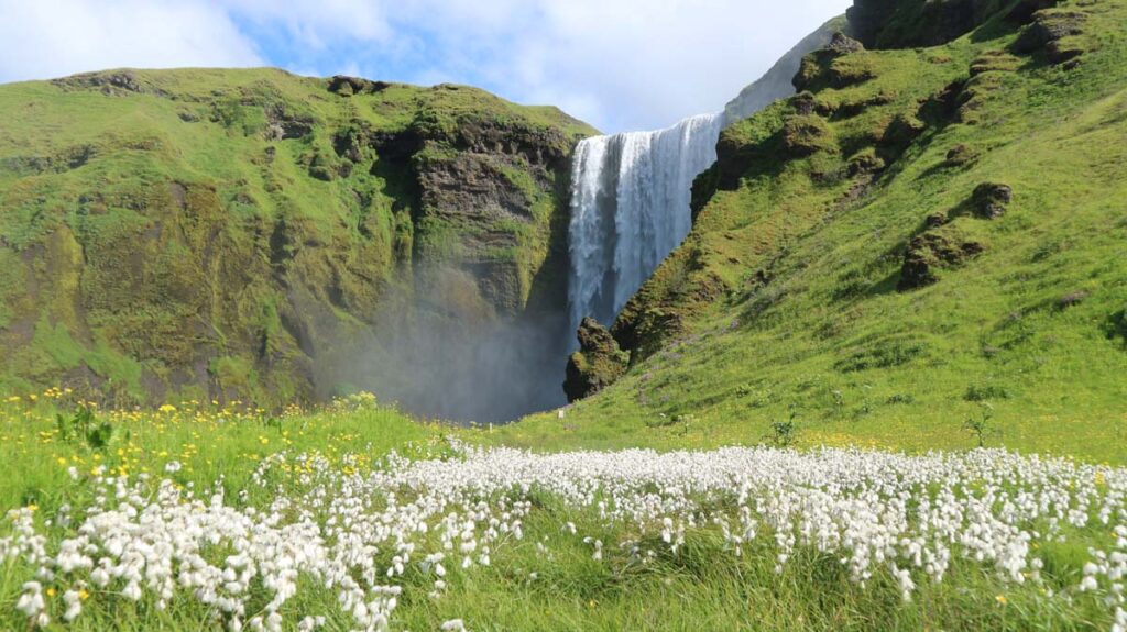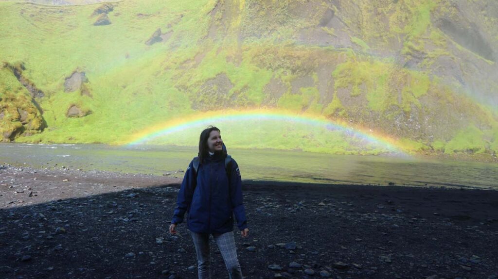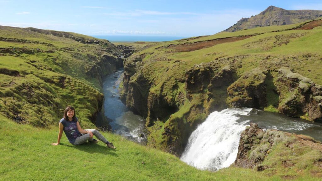 Це був справжній для нас виклик. Нам треба буде пройти від Скогара до Тосмарка 25 кілометрів через льодовик що знаходиться на висоті 1000 метрів. Все це треба зробити максимум за 10 годин, щоб встигнути на єдиний зворотний автобус з Тосмарка. Виклик був в тому, що ми ще в житті не робили підйом на кілометр, та не проходили 25 кілометрів за раз. У випадку провалу, ми не зможемо повернутися в Скогар, бо там не буде сьогодні взагалі автобусів. Але це ще не все, ми точно не подолаємо такий маршрут з речами, а ночувати ми будемо в місті Хела. Тож зайві речі в Рейк’явіку залишити не можна. Ми їхали в автобусі і морально готувалися до складного трюку, що вже одного разу провалився в Японії. За кілька хвилин зупинки в Хелі треба знайти де залишити речі, щоб увечері їх забрати. В Японії задум провалився по дуже незвичайній причині – саме в той день і в той час проходили антитерористичні навчання, і будь-які речі було заборонено залишати в камерах схову саме на тій зупинці. Давай, Андрій думай, продумуй усі можливі варіанти. Це я собі в голові казав. І ось зупинка, на старт, увага, марш! Я побіг до міні торгового центру, там ніхто не в курсі про камери схову, я бачу поштомат, відправлю сам собі, а ввечері заберу! А якщо речі поїдуть в сортувальний центр?! Думай, думай Андрію!!! Тут дзвонить Даша, що стереже автобус, нічого не чутно, поганий зв’язок. Даша повторює по колу “Кущі! Через дорогу є шикарні кущі!”. Прийнято, біжу з пакетом через трасу, забігаю в ліс, провалююсь по пояс в траву, добре що не потонув) Біжу далі в дерева, кладу речі, надійно заховано! Даша ти геній! Водій здивовано запитав, де ж ми змогли залишити цілий пакет зайвих речей. У лісі, у лісі… Такої відповіді водій точно не очікував. Як кажуть “П – пригоди”. Тепер головне, щоб ніякий шанхальський барс не з’їв наші чисті речі на наступний тиждень. По дорозі ми проїжджали доволі красиві водоспади, але автобус не зупинявся для фотозупинок. На щастя пояснення ми зрозуміли як тільки приїхали в Скогар. Тут був набагато крутіший водоспад і ясна сонячна погода. Ми подивилися в напрямку гір, Даша констатувала факт що сьогоднішній запланований маршрут є частиною п’ятиденного великого маршруту, на якому люди зупиняються на одну ночівлю. Той фрагмент, що ми зараз маємо пройти, зазвичай у людей займає два дні. Але в інтернеті є замітки декількох туристів, що долали цей маршрут за день, правда у зворотному напрямку. Анонімуси з інтернету, ми вам дуже вдячні, що ви залишили ці нотатки, завдяки вам і моїй виключній самовпевненості, ми на це наважилися. Маршрут починається зі Скогарського крутецького водоспаду.