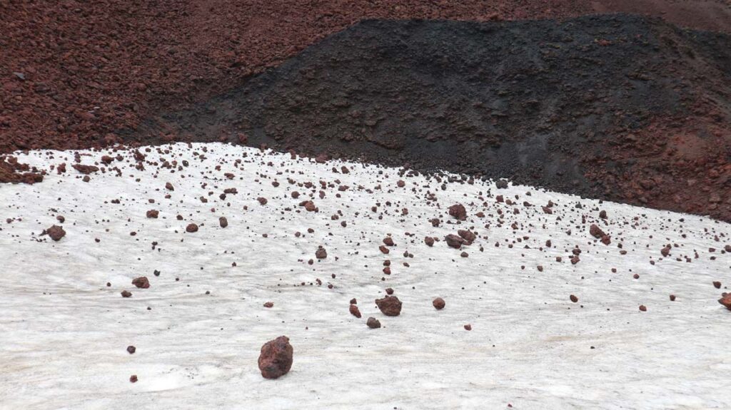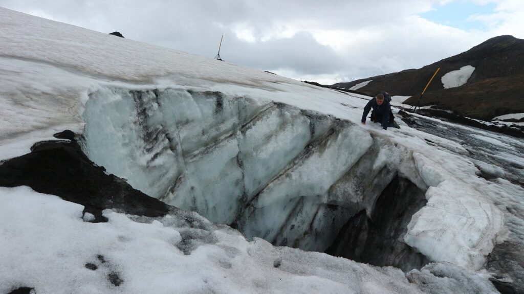 Тож довелося трохи відхилитися від маршруту. Інші туристи не розділяли нашої зацікавленості. Хоча як можна пропустити справжню велику воронку у льодовику. Ми з Дашею обійшли її з різних сторін, щоб кожен міг бачити товщу льоду під іншим. До речі, глибина снігу в цих місцях сягає до 900 метрів. Тут навіть є великі розломи, що ведуть в безодню. Так, повертаємося на маршрут. Тепер трохи підйому на вертикальну гору, і тепер ми нарешті на вершині. Я не знаю що тут діється взимку, але влітку тут справжня зима.