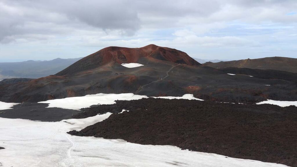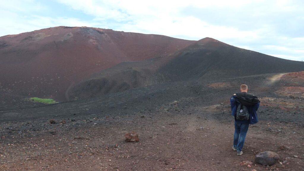 Тепер наш шлях був в іншу частину острова – ми підіймалися на потухлий темно-червоний вулкан. Тут є два вулкани, один менший, другий більший. Треба підійматися на менший і дивитися на більший. Але куди ми могли дивитися, то тільки під ноги. На вершині вулканічного хребта нас застав настільки потужний вітер, що був ризик злетіти з гори. Швидко усвідомили, що до вітру не можна повертатися перпендикулярно, треба щільно застібнути куртки і йти рівно посередині кількаметрової тропи. Якщо йти близько до краю звідки дме вітер, то тиск вітру тільки посилюється, якщо йти поруч з протилежним краєм, то просто здує. Я раджу під час вітру не повторювати наш досвід.