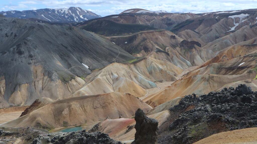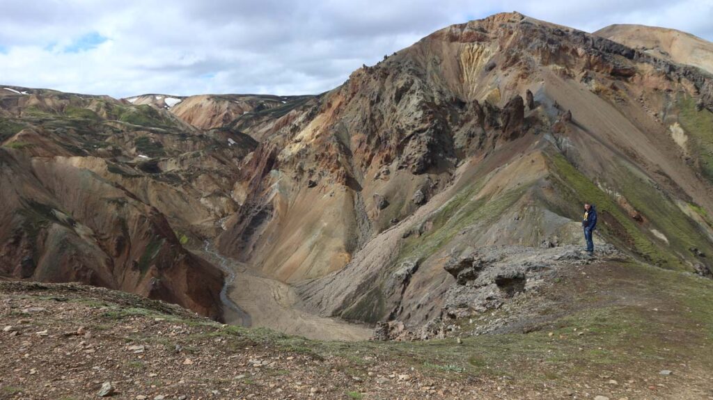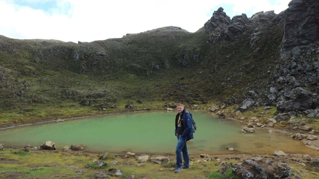 Щоб не витрачати поки час на гарячу каву, я собі зробив холодне фрапучино із розчинної кави і холодної води. Було смачно, але трохи розгризати доводилося. Тут є кількагодинний маршрут по колу, ми пішли у зворотному напрямку, щоб не перетинатися з людьми. Прогулянка маршрутом була наче ти гуляєш уві сні митця. При чому це його явно найяскравіший сон. Кольори в горах можна обрати на будь-який смак від синього до яскраво червоного. А додатковим бонусом буде кратерне озерце нереального кольору.