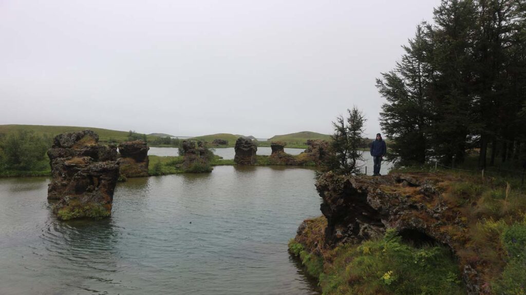 Автобус їде зранку в одну сторону, а ввечері назад. По маршруту автобуса є близько п’яти місць що треба подивитися, але проблема як завжди втому, що автобус тільки один, а місць п’ять. Між першою та останньою точкою приблизно 25 км, але відстань між автобусами приблизно п’ять годин. Тобто пішки не вийде. Але тут головне почати маршрут, нічого ж з нами критичного не трапиться. Погода сьогодні з ранку нас окутала семиградусним густим туманом. Завтра буде сонце, але й зворотний літак до Рейк’явіку. Тож краще сьогодні, без ризиків для вильоту. Доки їхали до першої нашої зупинки, то помітили, що купа людей вийшла на розкішному водоспаді. От же ж, тепер шість місць треба подивитися. Поки що ми поїхали далі і вийшли біля озера та кратерів. У будь-якому разі так заявляла мапа, бо через туман поки що нічого не було видно. Ну що ж, вперед! Це місце називається Skútustaðir. Схоже що це справжній пташиний рай, навіть в туманну погоду, кількість пташок нас радувала.