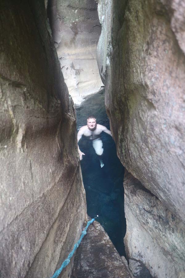 Замість мошок ми там знайшли розлом за яким знаходилося термальне, тепле, печерне озеро. Супер, ідеальне завершення довгого маршруту! Я не роздумуючи спустився по мотузці вниз до озера.