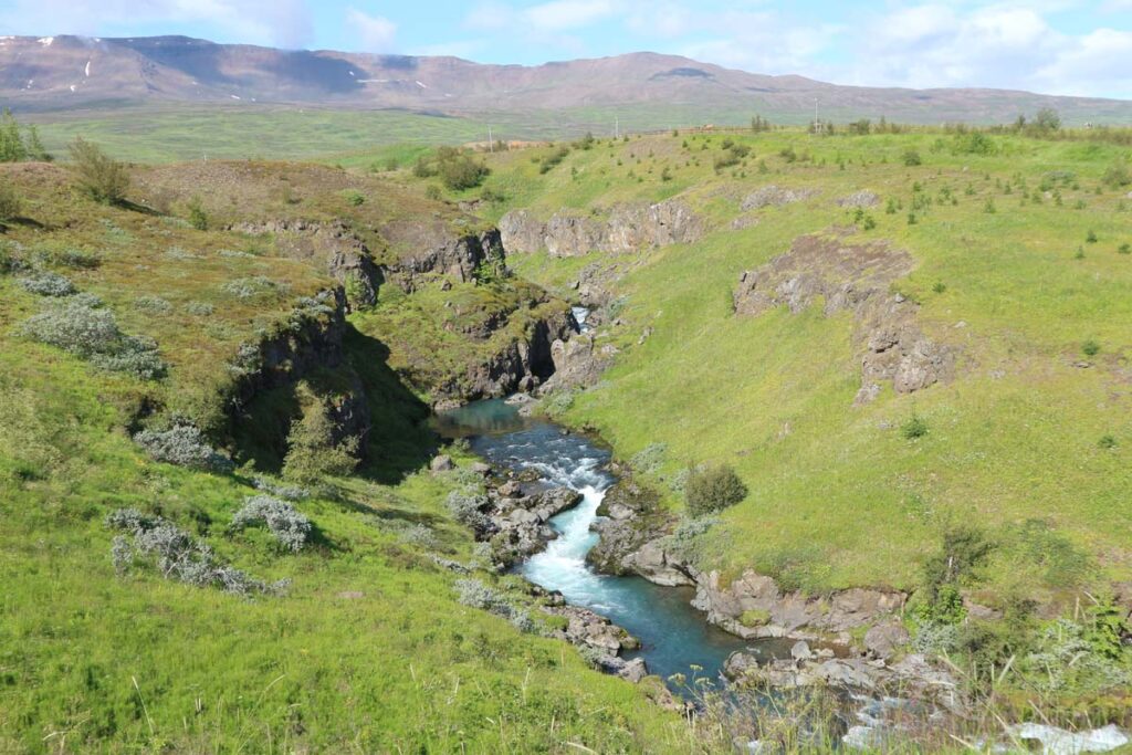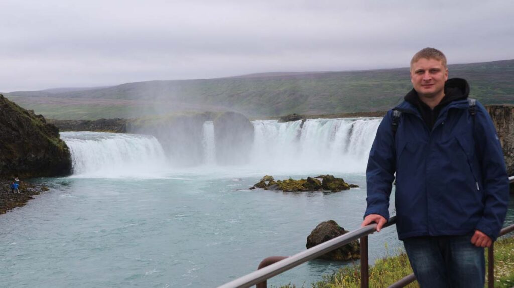 Мої зламані руки нарешті можуть витримувати вагу мого тіла! Це теж було радісне відкриття. Бо в моєму випадку мені ще чекати на повне зрощування кісток кілька років. Водичка тепла, приємна, ось тільки дно темне. Це завжди наводить трохи жаху. Я обережно поплив по напівтемному розломові. Але була проблема, вода дуже добре дзеркалила, і коли здавалося що можна пропливти, то з легкістю можна було врізатися в скелю. Тож треба було все робити обережно. У відгуках ніде не писалося що тут є озеро, чому його люди не помічають? Хоча потім ввечері ми все ж таки знайшли відгук “Обережно з озерами в цих розломах, там можуть бути токсичні водорості”. А, ось чому там ніхто не плавав… Хоча ми впевненні, що воно безпечне, інакше було б попередження. Поруч було ще одно озеро, в якому група туристів шукала схований скарб — геокеш. Так, тепер йдемо в супермаркет на каву і можемо сідати на автобус. Із супермаркетом була приємна несподіванка, бо окрім супермаркету в цьому районі схоже взагалі нічого немає. Водій автобуса запитав когось з туристів, що той встиг подивитися, той сказав що тільки Хверір оскільки автобусів більше не було, потім водій здивовано подивився на мене. Я перерахував, що ми встигли подивитися з того моменту як він нас у 25 кілометрах звідси висадив і він дуже пишався нами. Такс, ми тут ще бачили зранку бомбічний водоспад, тож два квитки до водоспаду Goðafoss, будь ласка, до Акурейрі потім вже якось доберемося. Водій правда ледве не проїхав водоспад, потім сказав, що на щастя ми досвідчені туристи тож з легкістю знайдемо дорогу. На щастя, він проїхав менше ніж на хвилину зупинку.