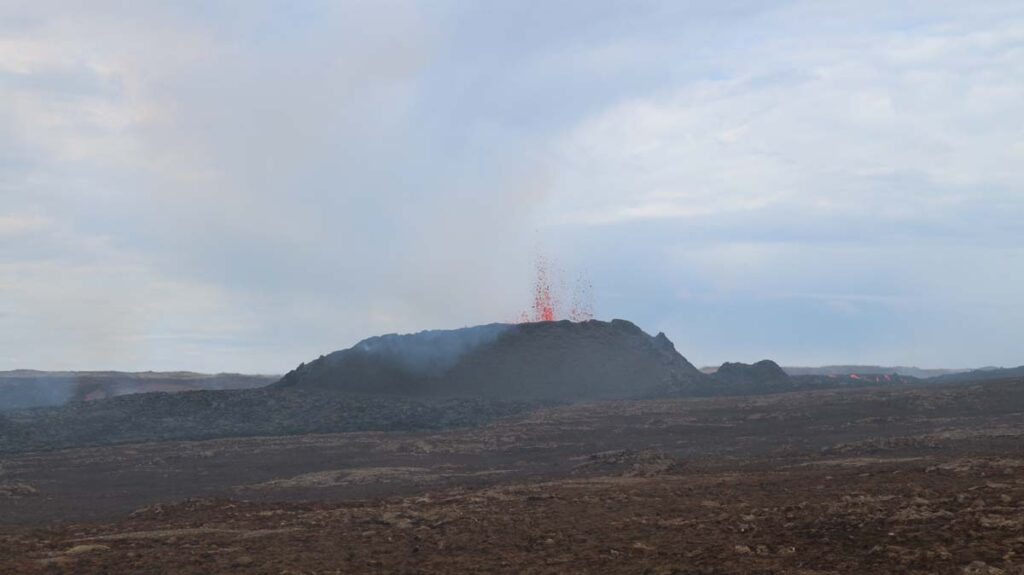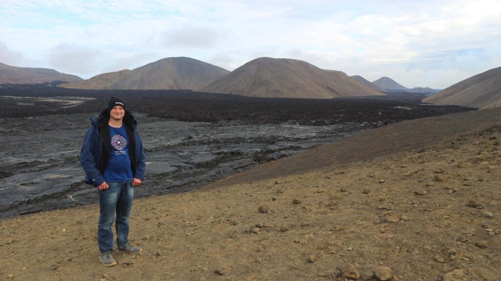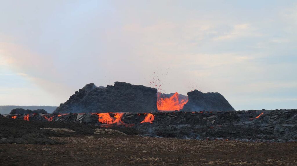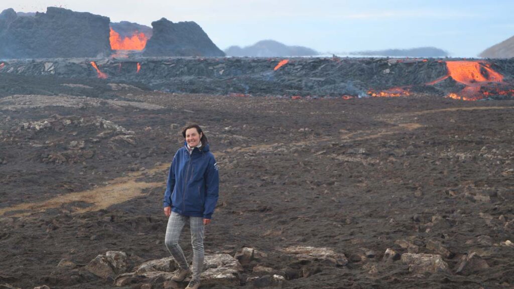 Але як я помітив тут діє принцип гри – кожен турист повинен пройти на метр далі ніж інші, виграє той хто не помер. Тож ми зіграли в справжній варіант ісландської версії “Гри у кальмара”. Справа від нас було два застиглих потоки, на вигляд доволі свіжі, стежка між ними шириною метра три. Один турист вирішив стати остаточним переможцем і пройшов між потоками. А чим ми гірші? Коли ми пройшли цей коридор, то відкрилося таке від чого перехопило дух. Ми бачили саме жерло, як там постійно вивергається лава, як течуть лавові ріки розчиняючи в собі породи, все це відбувається під справжній гул виверження. На цьому плато можна підійти ще ближче. Але Даша сказала що вже точно не варто ризикувати і чомусь сама ж побігла фоткатися в сторону лавового водоспадика. Ми були зачаровані, це найкрутіше що ми бачили в природі.