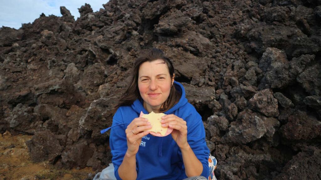 На щастя, увесь маршрут був майже по прямій, але на диво були люди що вже поверталися назад. Один кореєць пишаючись собою сказав, що почав маршрут о першій годині ночі. Виходить ми тут не ранні пташки. Було трохи дивно, адже навігатор показує, що в такому темпі ми дійдемо лише за півтори години. Спочатку ми проходили лаву, що димить ще з торішнього виверження, а потім ми дійшли до точки, після якої не можна йти далі, тому що не можна йти далі. До вулкана ще приблизно пів кілометра. Його вже добре видно і навіть видно як виплескується лава. Але якщо подивитися фотографії в інтернеті, то, м’яко кажучи, люди якось ближче підходили. Але нам вже дуже радісно. Тож починаємо свій перший вулканічний сніданок. Ми вмостилися за стіною застиглої лави, через яку продував гарячий вітер, тож навіть теплі речі можна було зняти.