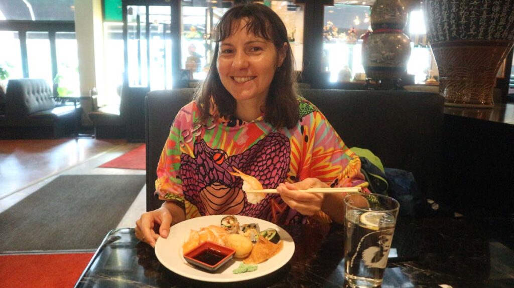 Перевага музею ще була в тому, що можна хоч трохи побути без дощу. Так, куди далі попливемо? А далі вже по чудовій скандинавській традиції нас чекав справжній шведській стіл із безлімітними сушами приблизно по 15 євро з людини. Доки ми йшли до закладу, ми бачили й інші шведські столи, що стояли у парках, але у ресторані все ж краще, бо з їжею)))