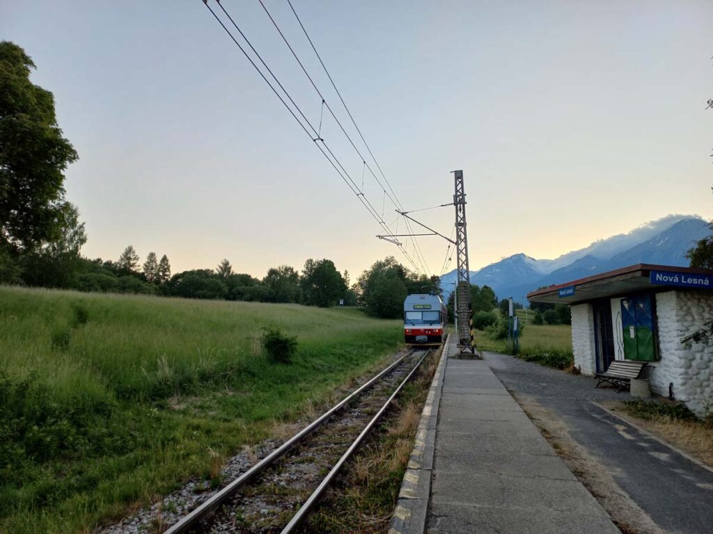 Тож треба повертатись униз і їхати далі. До речі ця зупинка у нас була на маршруті тільки завдяки, тому що тут була зупинка автобуса. Спочатку ми вагались чи підійматись сюди, але підійматись обов’язково треба. Поїхали далі. У цій гірській частині Словаччини дуже добра залізнична розв’язка. Тут курсує три потяги що об’єднують два курорти із Попрадом. Ціна за квиток залежить від відстані, але за частіше не більша за півтора євро з дорослого. Самі сегменти маршруту теж завдовжки у середньому 45 хвилин. Тож можна комфортно подорожувати. І потяги чекають друг на друга. Ми зробили пересадку на високих Татрах і поїхали до Попраду.