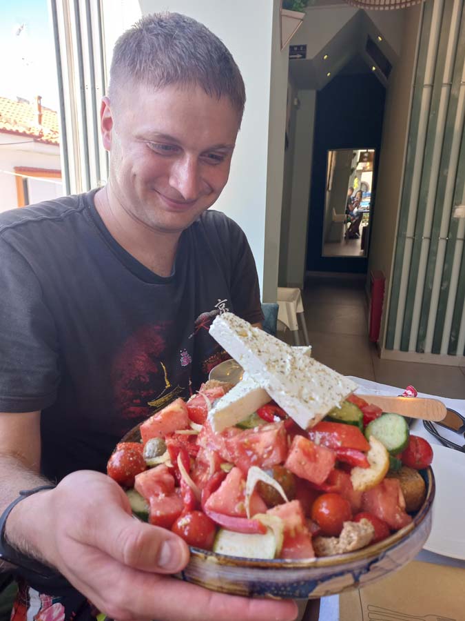 Пройшовши десь хвилин 15 біля нас зупинилась машина із двома жінками з Аргентини. Жінка сказала, що вона добре знає, як це подорожувати без машини і як це важливо коли тебе ввечері хтось підкидає до міста. Тож у нас вийшов зворотний автостоп, це коли машина нас стопнула. Ще десять хвилин тому я був готовий до зустрічі із барсом, а тепер ми у центрі в ресторані, де нам подають грецький салат із мусакою, а на десерт кавун як комплімент! Фактично за повний світовий день ми повністю виконали програму по Метеорах.
