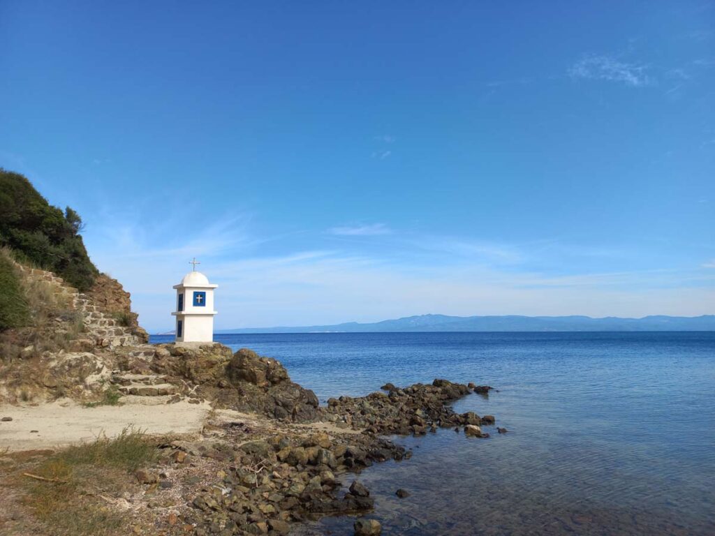 Цього разу тут додали каперси. Тепер можна покупатись у моречку та повертатись у Калітею. До речі, було дуже дивно, що у Греції наразі був несезон. Море ще відносно тепле, погода жарка, але чому нема туристів – питання. Халкідікі складаються із трьох півостровів у вигляді пальців. На цю подорож ми вибрали один із трьох – Касандру. Тож наступного ранку ми вирішили подивитись як виглядає крайня точка цього півострова.