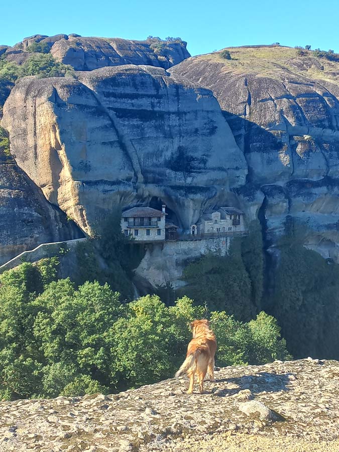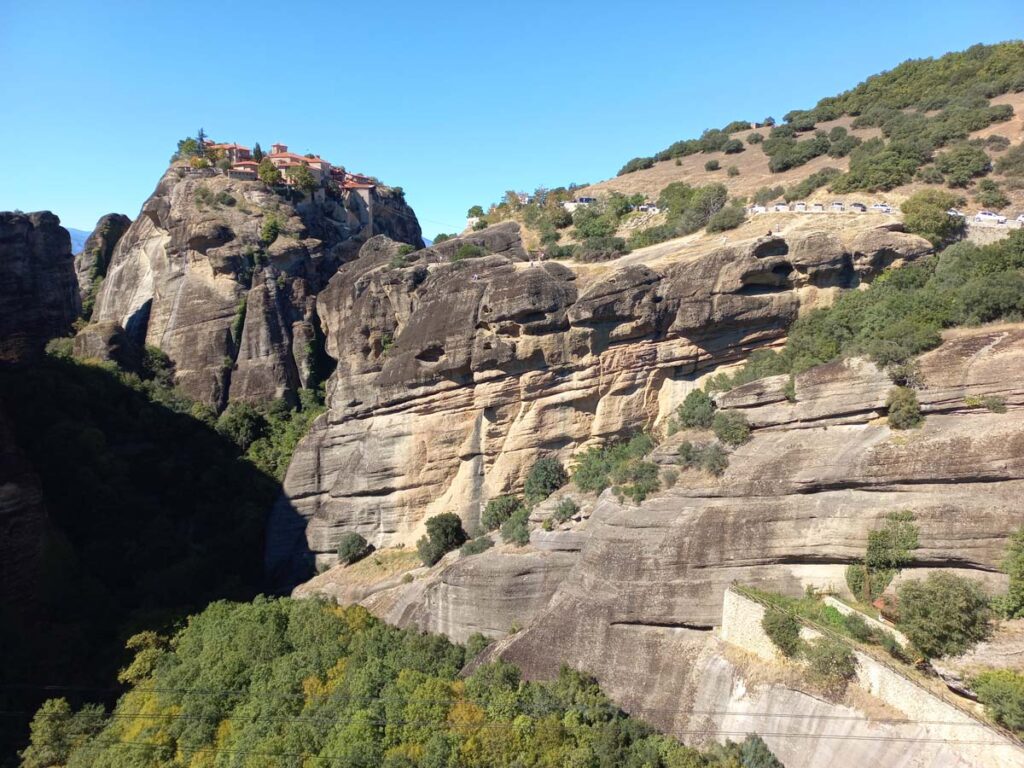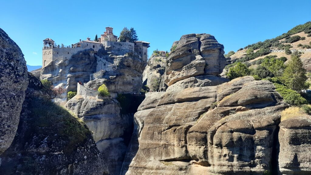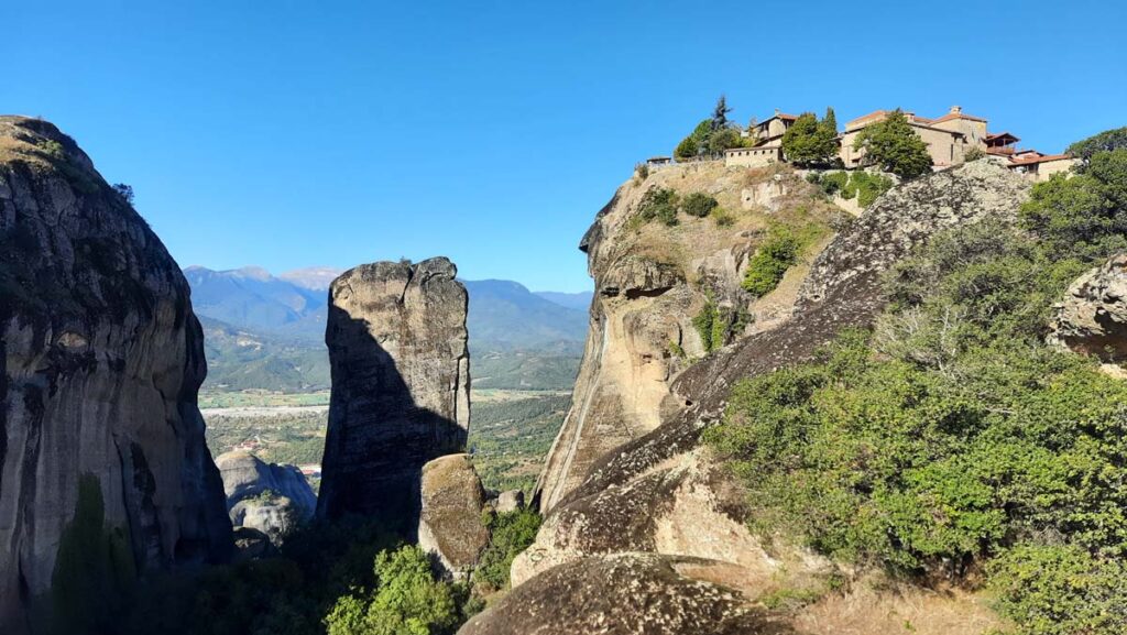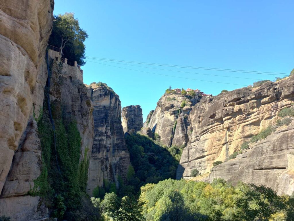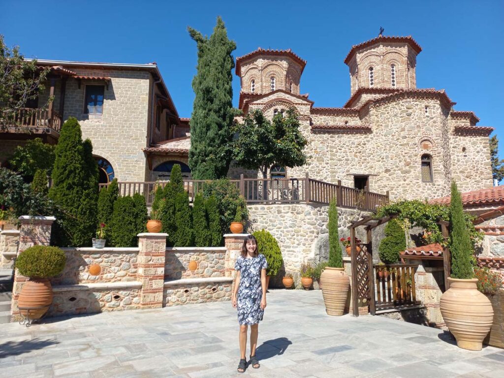 Тепер ми знову на одній із верхніх точок, ми зайшли ще в один монастир. Тут нас особливо вразила туалетна кімната з автоматичними дверима. Серед давнього монастиря це виглядає як портал у майбутнє. Ще, до речі, у монастирях є питна вода, що значно полегшує маршрут у жарку погоду. Наші друзі колись тут були влітку і сказали, що метеори при плюс сорока градусах можуть не дуже сподобатись, тож вибирайте правильний період.