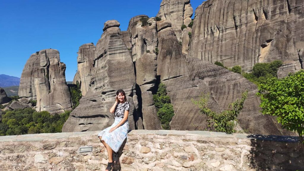Залізти на ті скелі то пів біди, а ось злізти, ще й зі зламаними руками не найлегша задача. Так, на жаль вже рік пройшов від падіння з велосипеда, а руки досі зламані, хоча фізично майже не обмежені. Як показав досвід, головне мати здорову голову на маршруті. При нас двоє азіатів спускалися із п’ятиметрової скелі дуже оригінальним способом. Спочатку чоловік це чомусь робив спиною до скелі протягом двох секунд і порадив зробити цей каскадерський трюк своїй дівчині. У нас той спуск займав кілька хвилин, оскільки майже не було за що зачепитись. Так от, на жаль, дівчина в той момент отримала цінний урок довіри. Але добре що обличчя ціле залишилось. По дорозі ми зайшли ще у два монастирі. Один із них як раз є візитівкою метеорів, він завжди для мене виглядав на фото якимось неприступним і я б ні за що не подумав, що туди можна потрапити без спец обладнання.