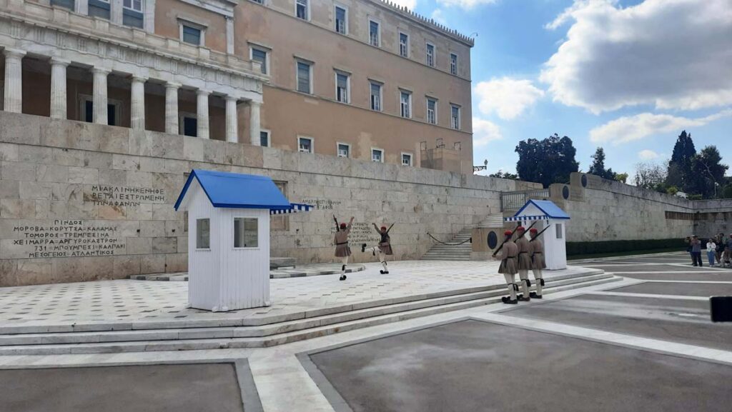 Якщо хочете отримати максимум задоволень від Афін, то бажано або жити у центрі або їхати до центра на метро, оминаючи панорами околиць. Якщо хочете зловити себе на думці, що потяг був не такий і страшний, то можна пішки пройтись від околиць до центру. Головне не зачепитись за брудний ніготь на нозі старої леді, що просить гроші на одній із вулиць. Мені здається, що я пишу не про Європу, а про кращі райони центральної Індії, але це стосується тільки околиць, самі Афіни то дійсно класне місце. Мало того, я із радістю додаю столицю до рекомендацій під час подорожі до Метеор. Головне не робіть нашу помилку – йти через околиці, щоб подивитись на зміну караулу. Перформанс тут проходить у такому ритмі, що коли ми у Кіото спостерігали за садом каменів, там було жвавіше.