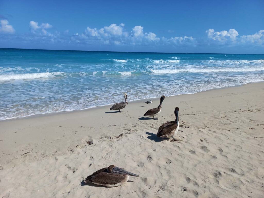 Цього разу було багато губкоподібних коралів, що прибоєм викинуло на берег. Цікавий факт, що в інші дні ми таких більше не бачили. Потім у нас було перше знайомство із місцевими справжніми господарями Куби — пеліканами. Ця зустріч була не тривала, оскільки пеліканам не було до нас ніякого діла і вони просто шукали собі рибку, у майбутньому у нас ще будуть дуже близькі зустрічі з ними. Птахи усвідомлюють свій розмір і підпускають до себе людей менше ніж відстань витягнутої руки. Бо такого велетня точно ніхто не наважиться образити, а може й рибки дадуть.
