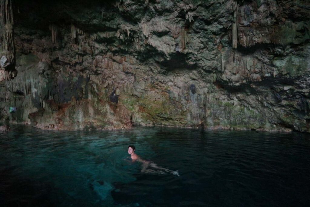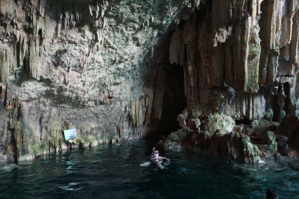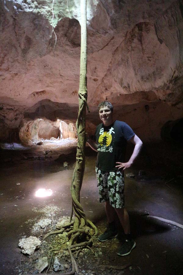 Тепер ми на роздоріжжі. Наліво підеш — підземне озеро знайдеш, направо підеш кораловий риф знайдеш! Ми почали із печери. Нас радісно вітали місцеві працівники, що збирали кокоси із пальм. Видно їм сподобалося, що навіть тут бувають дикі туристи. І ось я вперше займаюсь снорклінгом із маскою у підземному озері в глибокій печері.