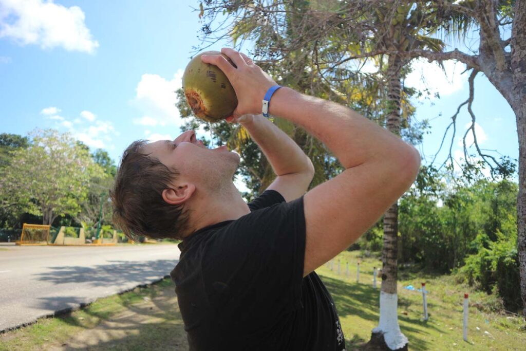 Накупались, обміняли у місцевого працівника ще песо про всяк випадок та пішли добувати собі воду. Не могли ж ми не скористатись можливістю у країні де всюди висять стиглі кокоси. Я один смачний помітив ще до того як дійшли до печери, тож приховав його на зворотній шлях. Оскільки ми відомі відкривачі кокосів, тож проблеми із відкриванням не було, тут головне мати міцного лоба! Це жарт. Але кокос не довго чинив опір. Зараз би я просто уявив би що це голова рашиста, так відкрив би ще легше.