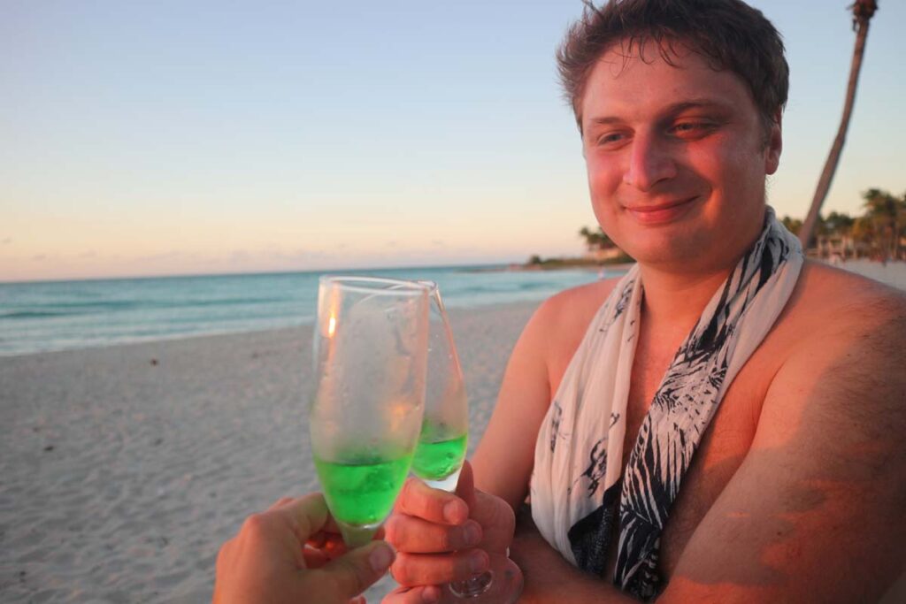 Можливо тут просто бізнес погано налагоджений, хоча у цій країні є дуже підприємливі люди. Наприклад, мені намагались впарити марихуану навіть під час плавання у морі. Погодьтесь, такого рівня сервісу ви ще не бачили. Коли ти плаваєш, до тебе підпливають і починають розповідати про асортимент. Особисто я бачу на Кубі багато потенціалу для потужного розвитку, але, здається, місцевий уряд щось робить не так. Наступним відкриттям був для нас один із сусідніх до нас готелів, він знаходився за поворотом берега, із водоростями на пляжі їм трохи не пощастило, але у готелю є родзинка. Кожен вечір на заході сонця тут грає жива музика, а бармен ходить і розносить усім глядачам коктейлі, при тому навіть якщо ти не з цього готелю, тобі теж із радістю принесуть.