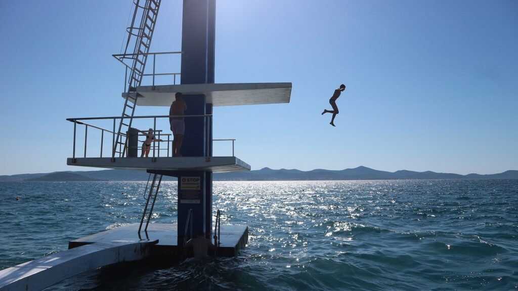 Хазяйка нам прислала повідомлення що ключі в середині апартаментів, тож можемо йти заселятися. Житло, як завжди в цій країні, на 10 з 10. Тут було все, а в холодильнику на нас чекали сливи та яблука. До речі, в Макарській були макарони, ми їх успішно з’їли, зате їм залишили половину пляшки лікеру. Проте помітили, що поцупили випадково у них прищіпку, зате забули у них ромашковий чай. Тож обмін пройшов повноцінний. Побігли скоріше вивчати місцеві пляжі та старе місто! Водичка на пляжах непогана, але не Макарська Рив’єра. Але те що тут є з крутого – вишка для стрибків у воду. Мишко не роздумуючи стрибнув з п’яти метрів і запитав мене “Тато, а ти ж будеш стрибати з десяти?”. Я дуже люблю стрибки в воду. Колись навіть був найуспішнішим стрибунцем у групі спортивного плавання. Але є проблема, у мене все ще зламані руки. Плавати я можу вільно, а ось зі стрибками є нюанс. Я не зможу балансувати рівновагу, оскільки треба тримати руки вертикально вгору, щоб не доламати їх об воду. Але ж мене не зупинило падіння з велосипеда від катання на велосипеді, так і перед вишкою я не зміг втриматися. Єдине що – інстинкт самозбереження з кожним роком все краще працює. Я заліз на верхівку і від погляду вниз у мене в прямому сенсі перехопило подих. Даша на мене дивилася в очікуванні, що буде далі. Але я вирішив, що якщо стрибну в цю секунду, то задихнуся. Це при тому, що у мене ніколи не було страху висоти.