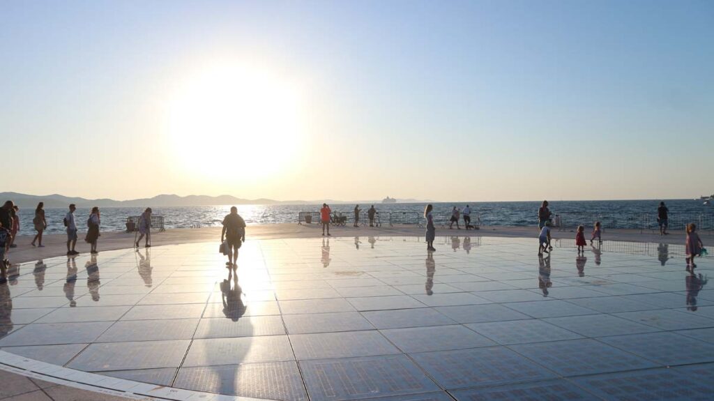 Так, четвертий десяток років дає про себе знати. Заспокоїв дихання і вперед, в політ! Скажімо так, з велосипеда кілька років тому я летів довше. Без рук стрибати виявилося доволі боляче. Але ж герой! А може просто божевільний. Але хто любить воду – мене зрозуміє. На щастя, стрибки пройшли без травм. Травма, як не дивно, чекала Мишка на пляжному душі, де було доволі слизько. Ну головне, що не на вишці. Тепер можна йти у старе місто, перевіряти які дива воно для нас має. Готовий побитися об заклад, якщо ви колись чули наживо орган, то для вас грала людина. Але ж кого цим здивуєш? Так ось, в Хорватії на органі навчили грати море! Тож ми пішли слухати морський концерт. А, так, старе місто доволі прикольне, але ж ви розумієте, що на фоні морського органа розповідати про місто вже буде не так цікаво. Ще неподалік від органа розташований “Привіт Сонцю”.