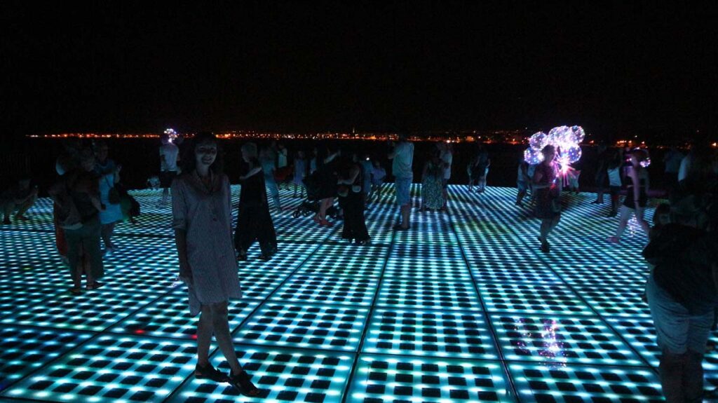 Це гігантська сонячна батарея що вдень заряджається, а вночі перетворюється на великий кольоровий танцмайданчик. Поруч ще є два менших “привіти”. Тож якщо ви послухали морський орган вдень, поверніться сюди ще увечері, подивитися як усе сяє.