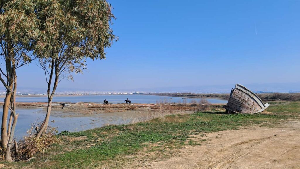 Якщо вам здається що у вас не вистачає складнощів в житті, то спробуйте в несезон заїхати до міста Міханіона, а потім спробувати дістатися назад до Салоніків. Ми планували, що з самого ранку туди поїдемо, погуляємо і ввечері з Анею та Віктором поплаваємо на човнику на заході сонця. Але красиві романтичні мрії то одне, а захід сонця в кращому випадку ми отримаємо з автобуса який взагалі не факт, що приїде. Це місто цікаве тим, що тут поруч море. А ще тут треба добувати тістечка до кави. Як нам сказала продавчиня, “Вони трохи заморожені, тож одразу не їжте”. Далі у нас задумувалася романтична прогулянка вздовж моря. Але знаєте, це як в іграх коли не вистачило потужності відеокарти і графіка трохи не провантажилося. Скажімо так, море тут є, але навколо нього точно не вистачає ландшафту. Доки ми йшли вздовж моря, нами зацікавилася зграя собак. Оскільки людей вони схоже ніколи не бачили, то тримали від нас дистанцію метрів сто, але вірно йшли по слідах. Коли графіка нарешті провантажилася, то з’явилося озеро із купою фламінго.