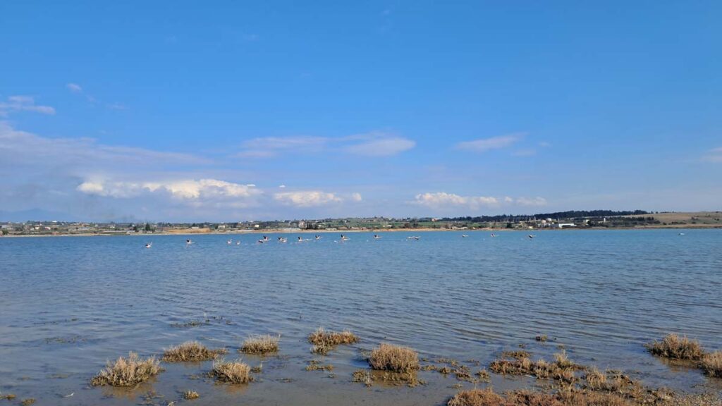 На околицях міста є солоне озеро. На щастя, про наявність цього озера знають не тільки туристи, а й фламінго. За 12 років подорожей ми намагалися вполювати фламінго на Кіпрі та в Тунісі, але безуспішно. Один раз ми їх бачили в Болівії і точно пам’ятаємо, що це такі птахи, які на кожен твій крок в їх сторону роблять два великі кроки в протилежну. Вони як міраж, якого ніколи не можна досягти. Подивимося, як нам пощастить цього разу. Спочатку треба їхати далеко-далеко за місто. Тож треба вполювати грецький автобус. Головна проблема країни в тому, що вполювати потрібний номер автобуса набагато важче ніж фламінго. І тут діє правило “півтора”, якщо написано що автобус ходить кожні 10 хвилин, значить чекати доведеться мінімум 15. При чому чекати краще не на зупинці, щоб не сполохати здобич. Ще біда в тому, що одним автобусом доїхати не можна… Скажімо так, ви повинні дійсно дуже хотіти побачити фламінго щоб вплутатися в цю авантюру!