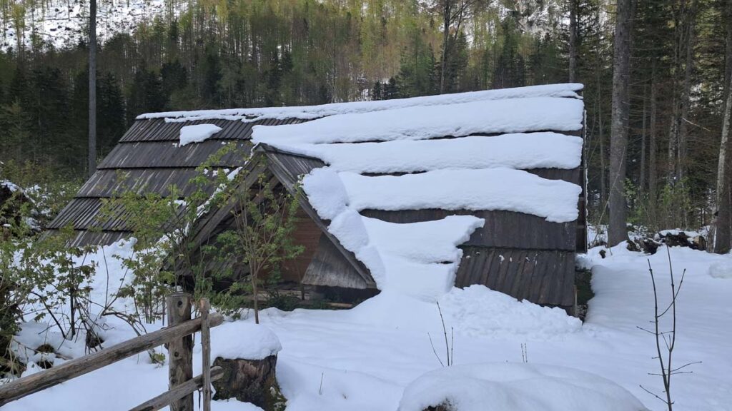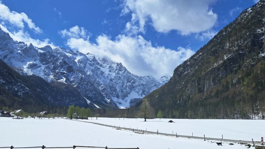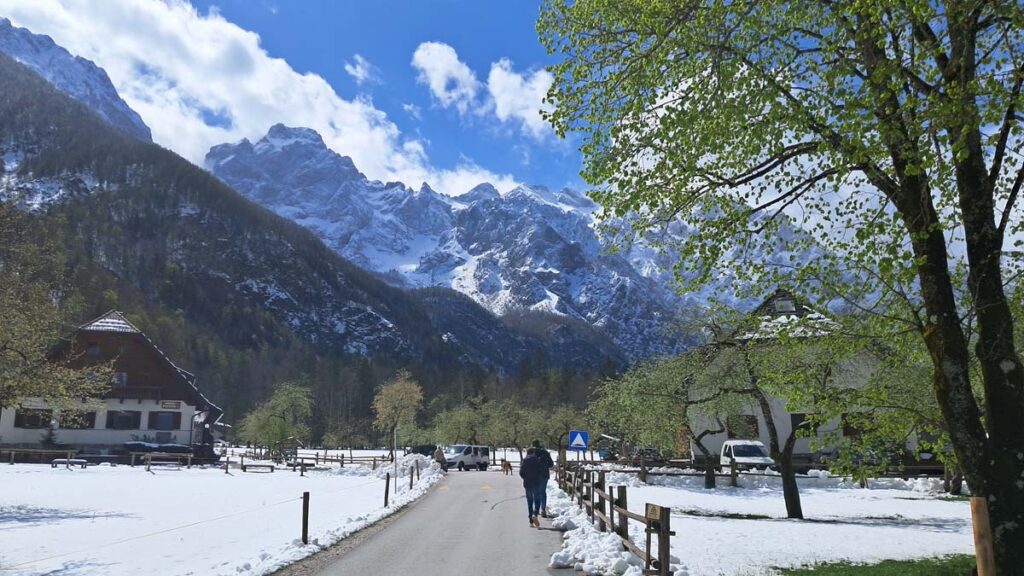 За півтори години автобус нас завіз кудись в самий куток країни. Можливо ми тут взагалі перші люди у світі! А ні, он в туристік інформейшені сидить жінка. До Логарської долини близько семи кілометрів, але зворотний автобус буде через 5 годин, тож у нас не дуже багато часу щоб йти додаткових сім кілометрів. Працівниця повідомила, що автобус тут ще не винайшли. Але є електровелосипеди. Це гарна новина! Але інформейшен центр закриється через три години. Це вже не дуже гарна новина. А ціна велосипедів по 45 євро з людини! А… ну тоді… нам за великим рахунком не так важливо о котрій вони зачиняються. Ми ще раз уточнили ціну, таки так, за родину 135 євро треба викласти щоб покататися на велосипеді, і що дивно, за таку ціну велосипед собі залишити не можна. Тоді як і планували, автостоп. Про це нам додатково повідомив і водій автобуса і жінки з інформейшен центру. Тепер залишилося тільки машини тут знайти. Їх не те щоб мало, вони тут не їздять. А ні, он одна їде. І навіть зупиняється! І заїжджає в гараж перед нами… Оскільки наступна машина тут з’явиться можливо влітку, то я пішов до пані вести важливі переговори. Після довгих переговорів з’ясувалося, що жінка говорить тільки словенською. І, на щастя, вона не знала як англійською відмовити наполегливим туристам. Тож махнула рукою щоб ми сідали в її машину. Даша мене запитала про що я домовився з жінкою, а я відповів, що не знаю. Добре хоч я багато гуглив і знав, що в самій долині є дорогий готель Плєснік, ось на цьому слові ми з водієм і зійшлися.