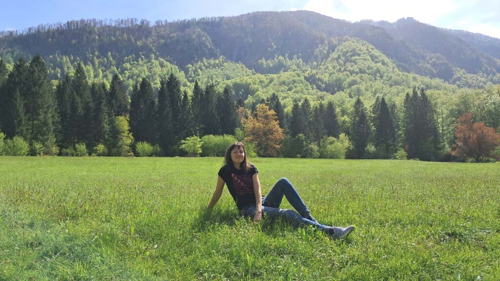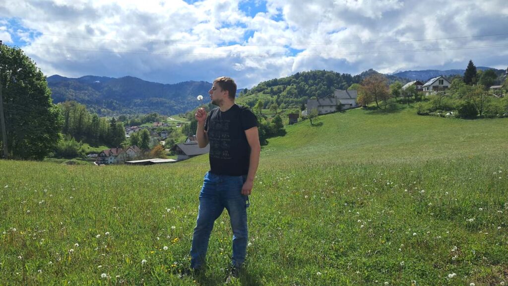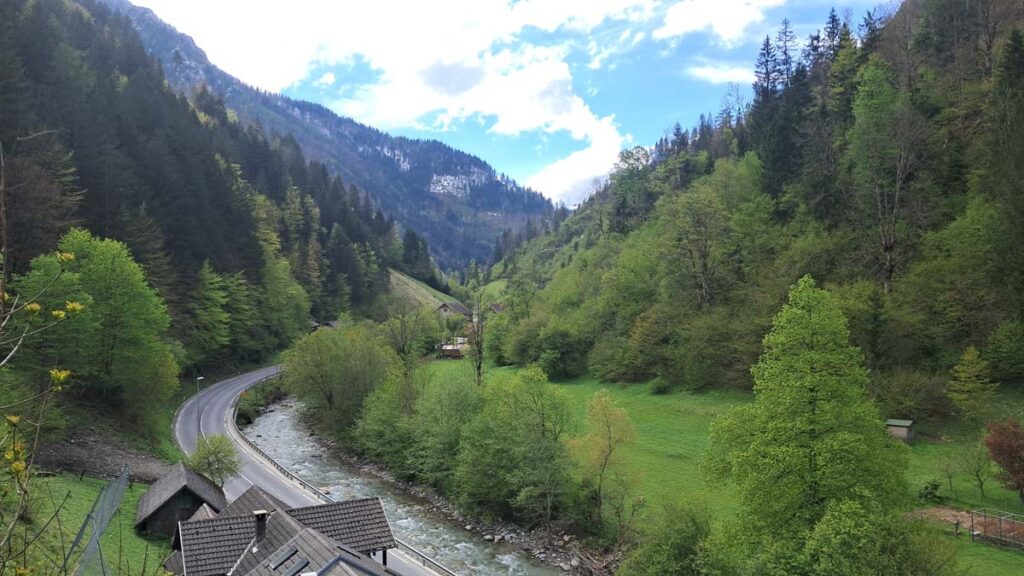 Було дуже складно спланувати цей фрагмент маршруту, бо всюди було написано, що варто побувати в Логарській долині, але ніде не сказано як туди дістатися публічним транспортом. Тож маршрут був трохи ненадійним, але начебто все мало скластися. Спочатку ми на автобусі поїхали до села Шемпетр. Там ми смачно поїли буреків в місцевому супермаркеті. А далі нас має забрати автобус і довезти до села Солчава. Після цього нам потрібно буде ловити автостоп. Знаю, звучить як “надійний на всі сто план”, але за великим рахунком, або так, або ніяк. Як не дивно, на безлюдну зупинку Шемпетра таки приїхав автобус, і він навіть дійсно повіз нас у Солчаву. Все не так вже і погано. Не знаю як там буде в Логарській долині, але за вікнами вже види трохи схожі на Норвежські. Безмежно красиві лани та гори, ріки та пороги-водоспади, люди всюди гуляють, собаки радіють. Все соковито-зелене. Гармонія така, що в автобусі можна медитувати. Але у нас вища мета, причому вища в прямому сенсі цього слова.