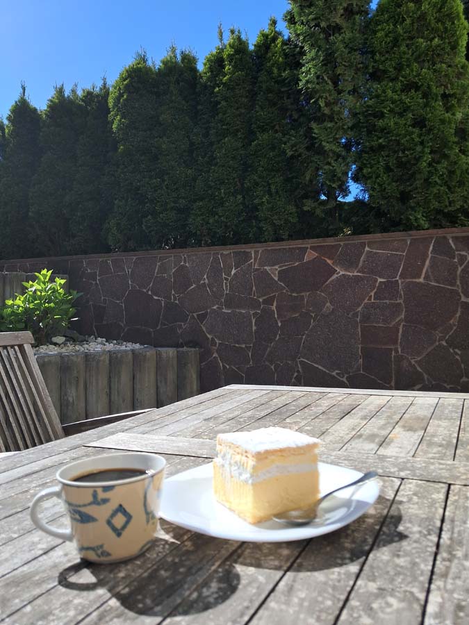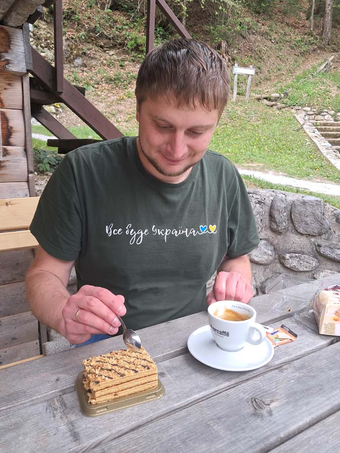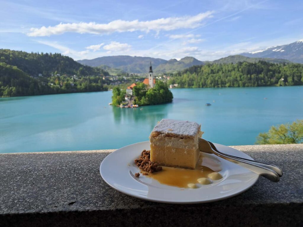 Тепер треба випити кавусю і буде взагалі вогнина. Але зі сторони де ми вийшли, кавуся з фірмовим тістечком коштували дорого, і в кожній наступній кав’ярні ще дорожче. Аж нарешті ми знайшли вуличну кав’ярню. Добродушна жінка із посмішкою повідомила нам, що тільки що закінчила розбирати кавомашину для тотальної чистки. У них навіть те фірмове тістечко в холодильнику було. Ну добре, пішли вздовж озера, там ще буде ресторанчик. Коли ми дійшли до ресторанчика, то побачили високі сходи. Ну добре, почнемо підйом в гори. Коли здавалося що сходи нарешті закінчилися, то з’ясувалися що вони тільки почалися. Пам’ятаю, як я радів тому дню, коли ми закінчили підйом. По вигляду було видно, що ми можливо зайшли у найдорожчий ресторан не тільки у Словенії, а й можливо у нашій сонячній системі. Ну значить спробуємо преміальне тістечко, як раз вільний столик на терасі з видом на озеро.