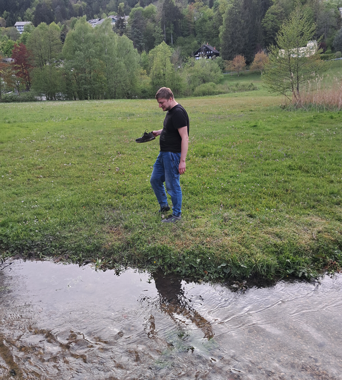 Далі було дві новини – я річку таки перестрибнув, але з тої сторони було болото. Мій кросівок засмоктало настільки глибоко, що коли я виліз, то навіть не бачив його в дірі. Ну хоч родину повеселив).