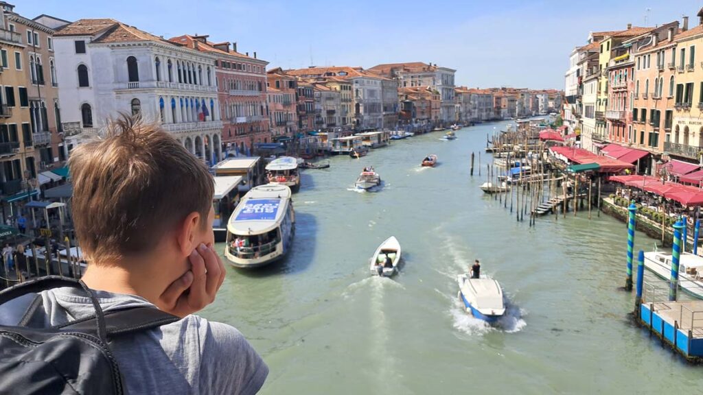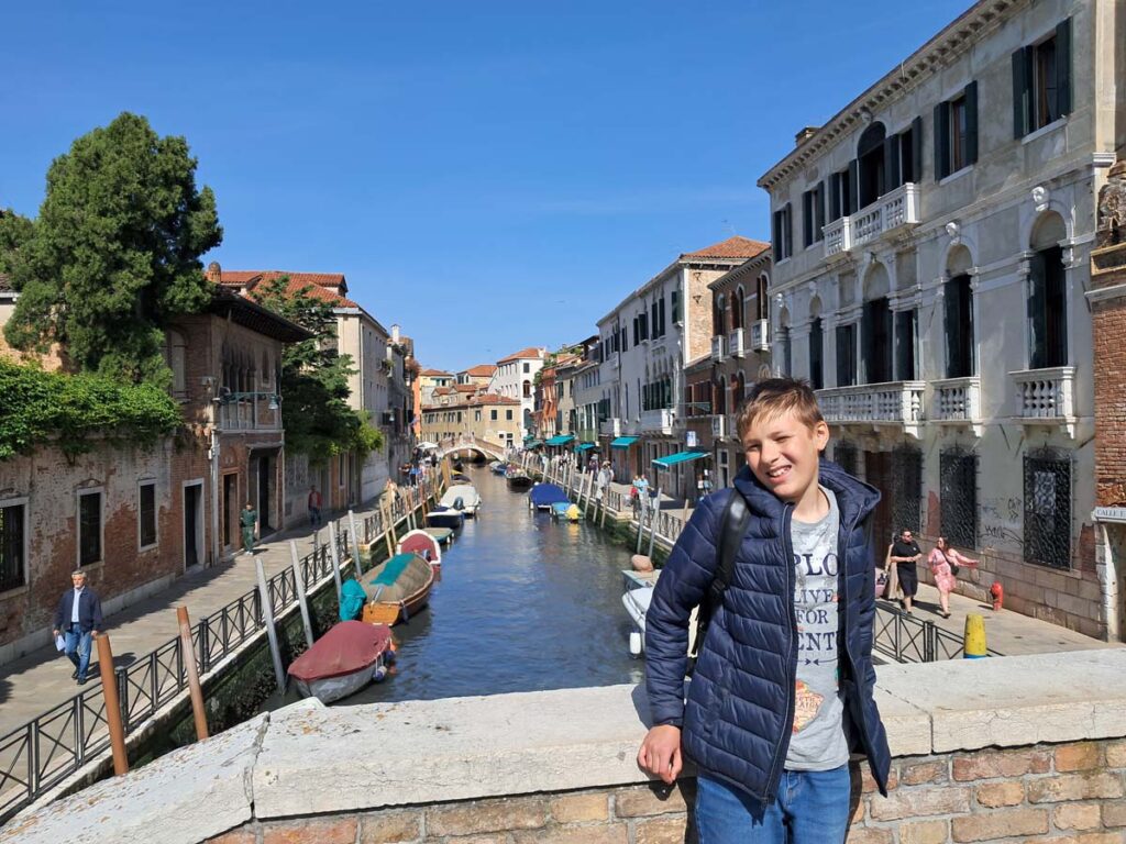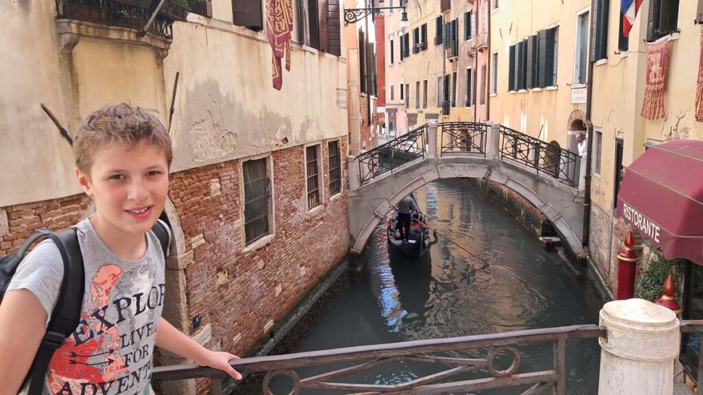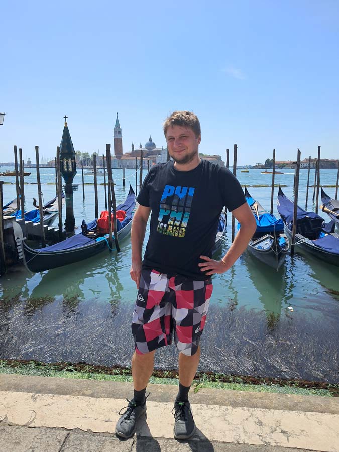 У нас був прямий трансфер з Любляни до аеропорту Тревізо. Але на літак чекати близько п’яти годин. Ми запитали водія чи не треба йому далі їхати у Венецію. Водій з нами поторгувався і вирішив взагалі прибрати той аеропорт з маршруту. З нами їхала ще китайка та китаєць, який не розмовляв англійською. Хоч маршрут і мав бути експресом, але водій зупинявся біля трьох різних магазинів, а його помічник кожен раз вибігав і щось купував. Потім під час дороги вони заповнювали лотерейку, в якій схоже треба було щось купити за обмежений проміжок часу) Я задрімав, коли відкрив очі, то за вікном вже була Венеція. Водій гордо сказав “Венеція”. В цей момент китаєць який не розмовляв англійською, поцікавився чистою англійською, коли буде аеропорт Тревізо. Водій почав переконувати китайця, що у нього квитки саме у Венецію. І потім навіть показав туристу роздрукований список пасажирів, але то виявився не той китаєць в списку. На щастя, у хлопця до літака було ще чотири години. У нас же на Венецію було трохи більше двох годин. До речі, це була Мишкова перша Венеція, наша третя. Місто доволі унікальне, як мінімум тим, що вхід у місто платний… Я теж довго не міг повірити. Тепер є 29 днів у році коли ти маєш платити, щоб потрапити у місто.