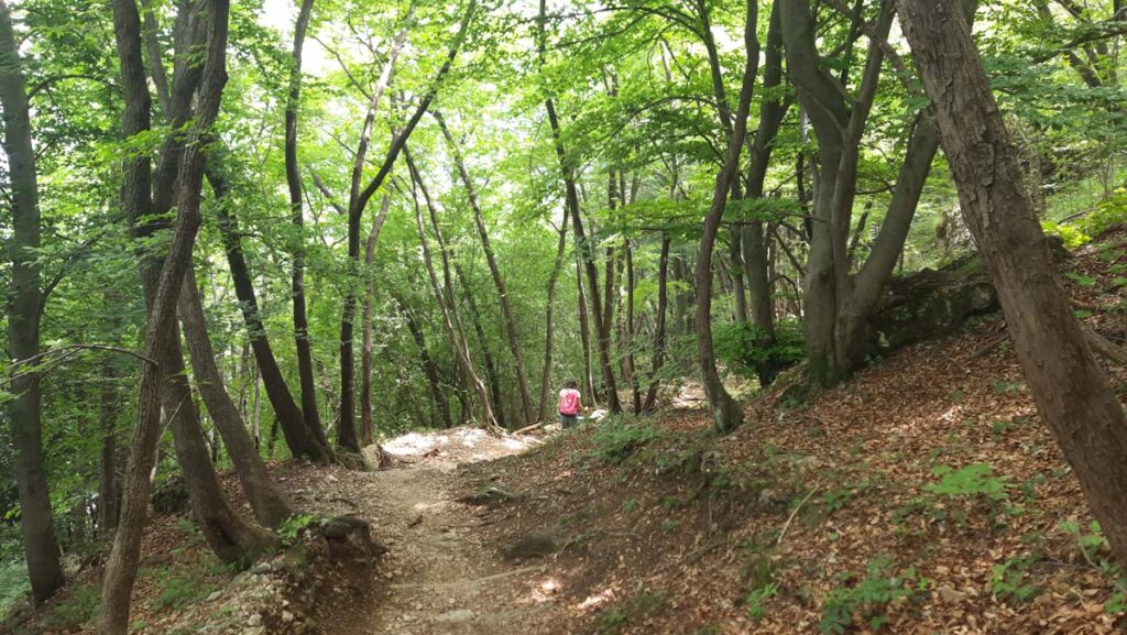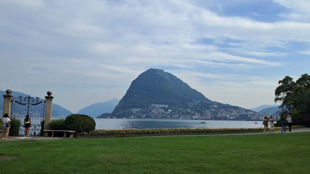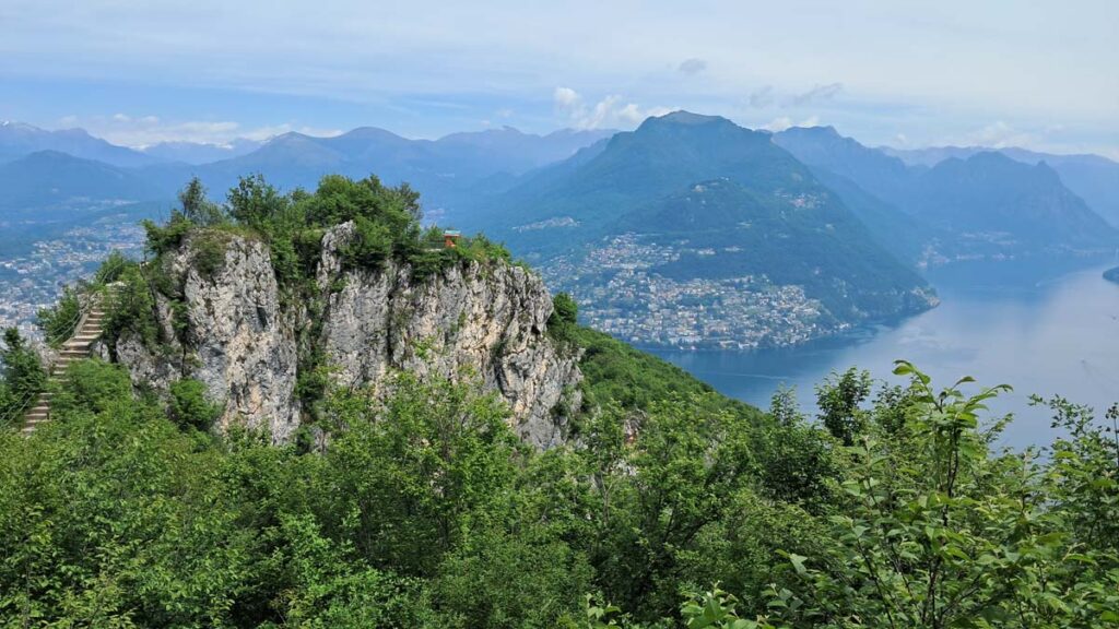 Лугано це озеро яскравих панорам, навіть по дорозі до гори вже можна зловити купу красивих видів. Чим далі ми йшли, тим більше розуміли, що навігатор нас веде саме на цю гору. Невже туди взагалі реально піднятися пішки? А он фунікулер, зараз запитаємо. А по 35 франків з людини… ну то пішки, значить пішки! Дуже яскравий початок маршруту, через дикий сад тропічних рослин. Тут взагалі приємне тропічне повітря, як у нас в Криму.