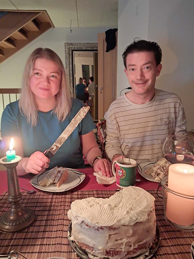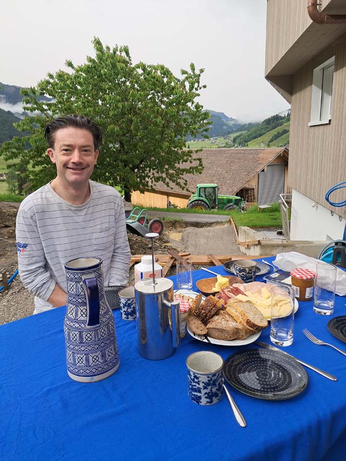 Таня нас познайомила зі своїм швейцарським сьогоденням. У Тані тепер є грядка на якій вона бореться зі справжніми швейцарськими слимаками! Це аналог битви проти колорадських жуків в українських селах. А ще ми познайомилися із їх кицькою, яка схоже планує стати науковим інженером і тому їй усе цікаво. З самого ранку у нас був сніданок на природі біля будинку.