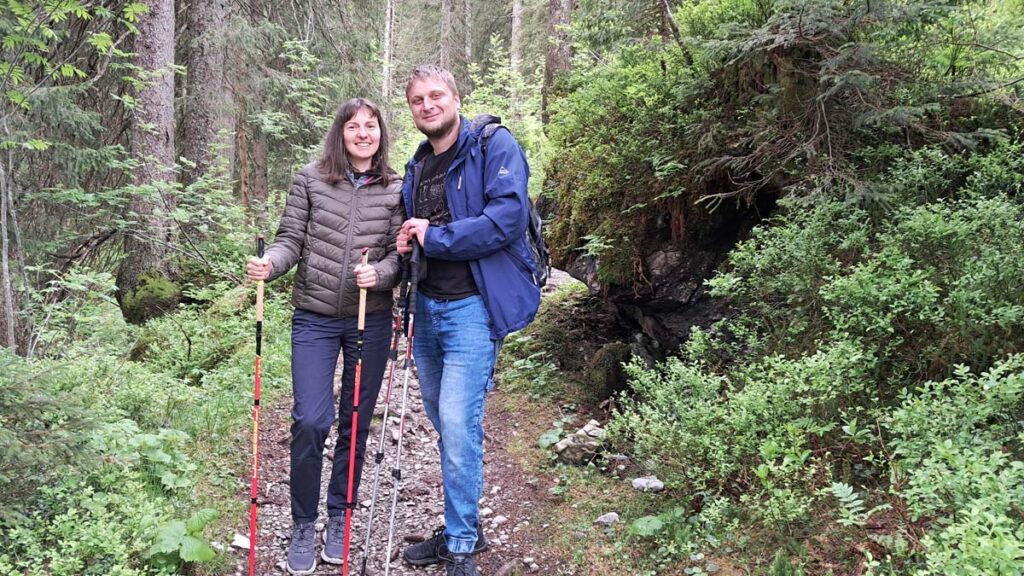 Мені взагалі здається, що тут дощі спеціально чекають доки ти опинишся на вулиці максимально далеко від накриття. Як раз сьогоднішній день був показовий. Ми повернулися до Тані і я вирішив, що погода доволі стабільна і потягнув Дашу гуляти. Таня нам влаштувала підвечірок із фруктового салату та апероль шприца на фоні зеленої долини. Тепер ми знову готові підкорювати гори. Таня нам поставила на карті мітки куди треба дійти.