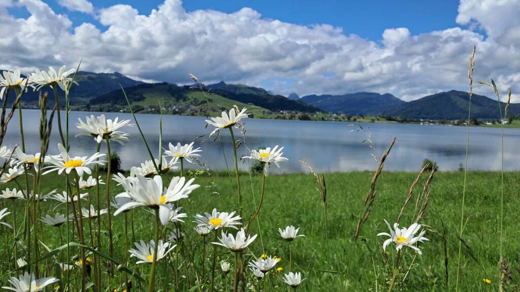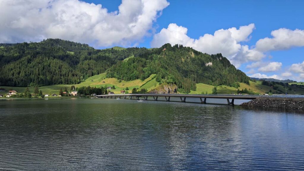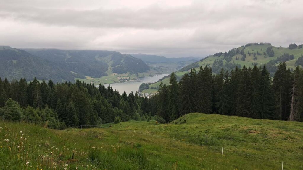 Швейцарія нарешті прийняла нас у свої обійми і вперше за дві подорожі освітила долину з озером кантону Швіц яскравим сонцем. Минулого разу я тільки міг уявляти як вона виглядає без туманів і дощів. А тепер Білочка та Зайчик мчать на велосипедах під теплими сонячними променями вздовж великого нескінченного озера. Один тільки мінус, якщо дивитися по сторонах, то можна впасти з велосипеда.