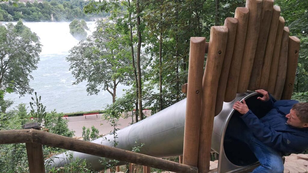 Скажу так, ми бачили найповноводніший у світі водоспад, нас тут вразити важко. Але як і з Ісландією, цей водоспад викликав справжній ефект Вау. Незрозуміло було в якій послідовності взагалі його дивитися. Але спочатку треба спуститися зі станції. Спуск тут доволі продуманий – сідаєш в трубу і їдеш до низу. Місцевий дідусь із зацікавленістю спостерігав як ми ліземо в трубу, але сам чомусь не ризикнув.
