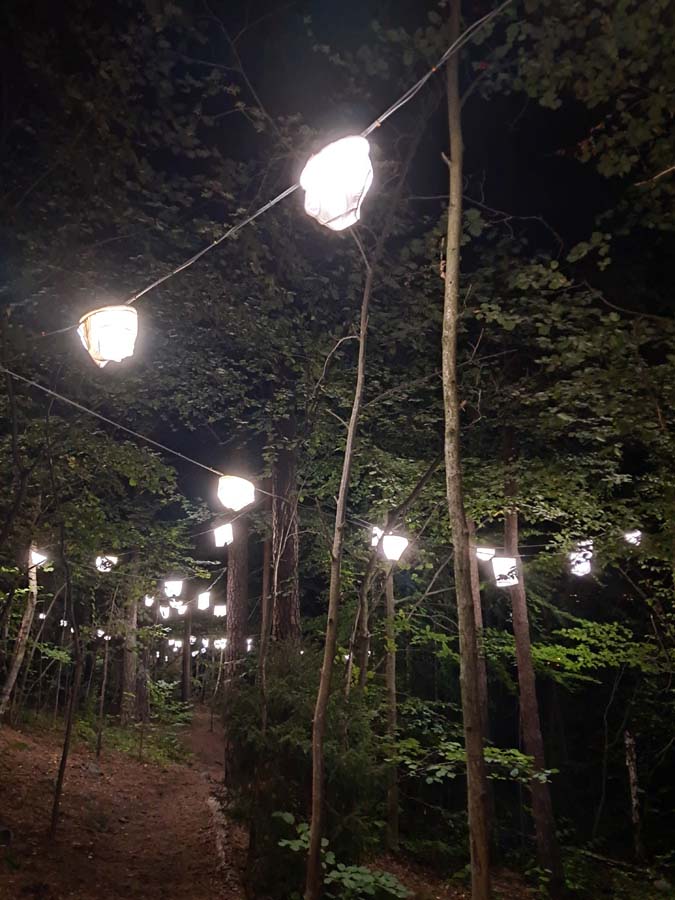 Але це явно не наша ціль. Вдалині було видно, що між деревами щось яскраве світиться. Ті світлячки виявилися великою кількістю ліхтариків розміром з кулак, що висіли між деревами. Вони граційно міняли свій колір в такт до таємничих звуків, що тихо лунали десь з колонок. Магії не було кінця! Норвегія вміє вразити! Можливо вони тестують інсталяцію для японського експо, подивимося. В тих ліхтарних джунглях хотілося загубитися і залишитися на вічність. Вони чудово грали нашими емоціями. Шкода, що наш час обмежений, і він коротший за вічність.