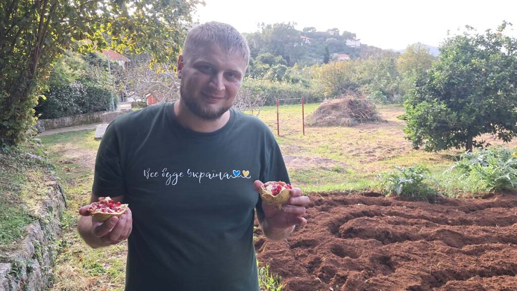 Пором начебто має бути за кілька годин. Тепер ми вдвох на маршруті. Заховали речі в кущі і полізли підкорювати нові вершини, в нагороду за нашу невтомність нас зустріло гранатове дерево зі стиглим солодким гранатом.