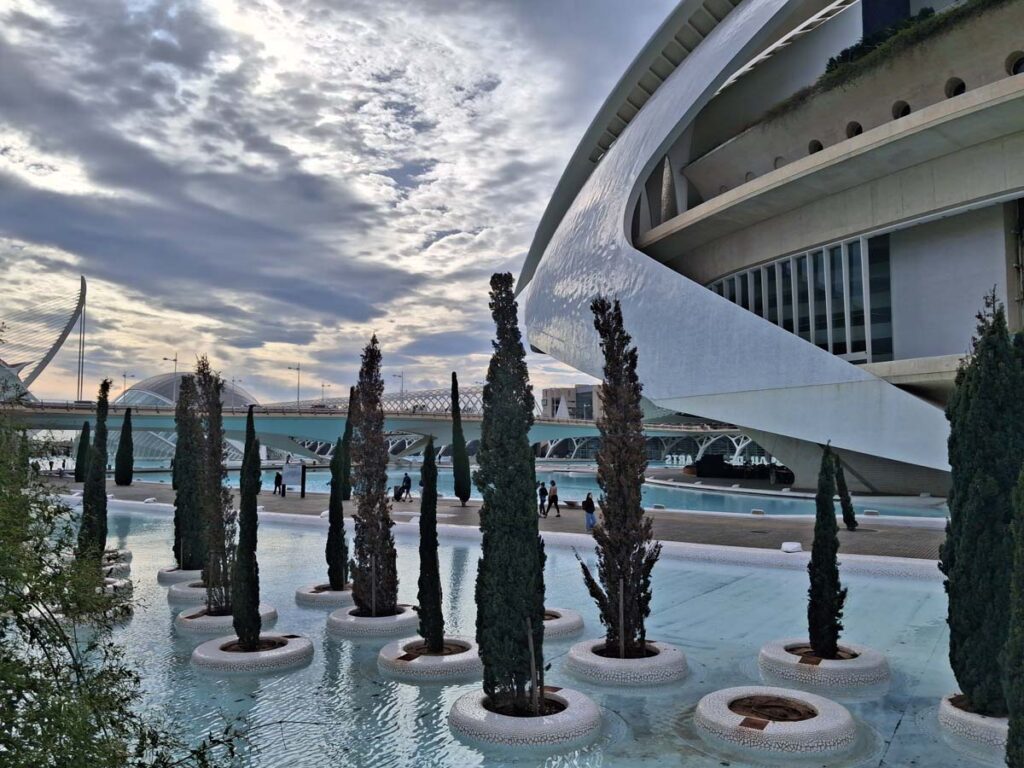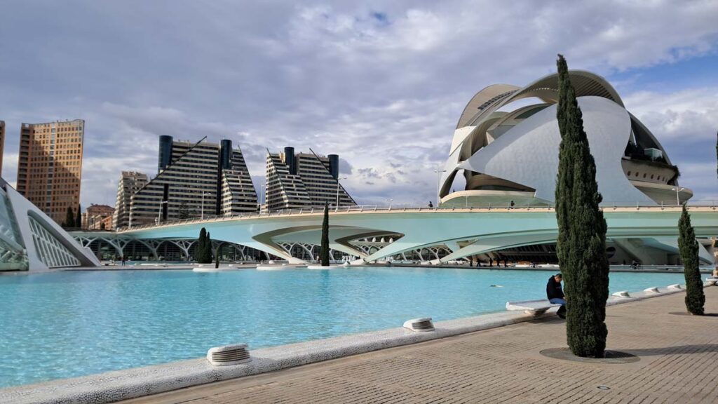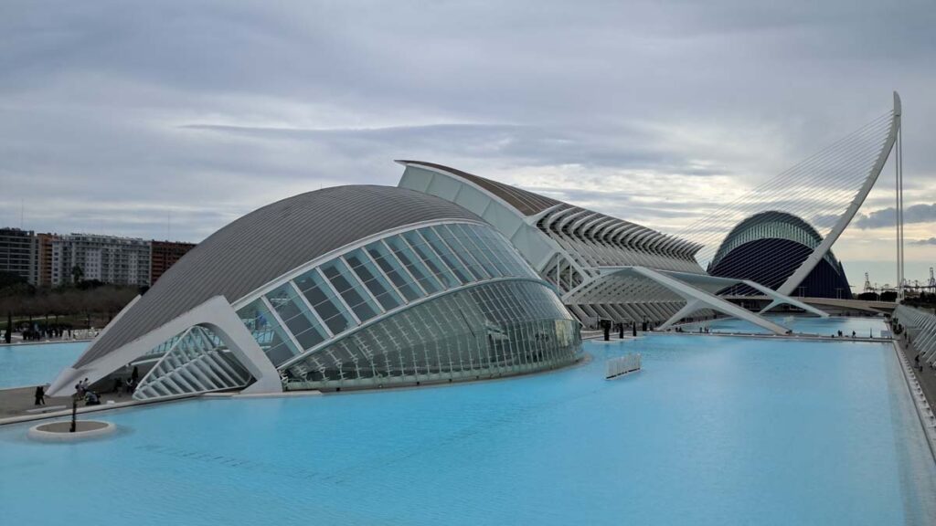 Це район у футуристичному стилі, дуже схожий на такий, які будуються для всесвітніх виставок Експо. Ну як мінімум зараз він здається у футуристичному, колись у майбутньому його назвуть ретрофутуристичним) Але ж як круто та дивовижно він виглядає! Ми навіть почали розпитувати ШІ чи не пов’язаний цей район з експо, що проводилося у Валенсії, але ні, це просто такий крутий район.