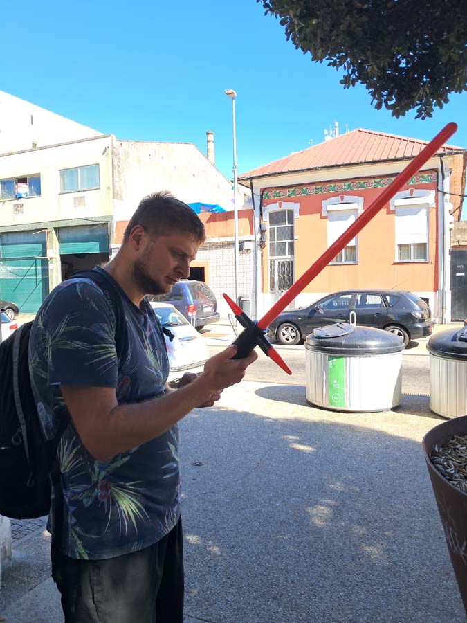 Кожен день у каміно – це як окрема історія, сьогодні каміно випробовувало нас поставивши на шляху гелікоптер. Хороший крок, але ми не спокусимося і дійдемо пішки! Далі був справжній джедайський меч! Прямо лежав у коробці біля паркану. Я його помітив, тож, схоже, це був знак для мене. Але знак чого саме? Що мені шлях цим хоче сказати? Якщо минулого року всюди попадалися шкірки банана і ми не змогли зрозуміти до чого це, то джедайський меч тим паче! Можливо щось про внутрішню силу?