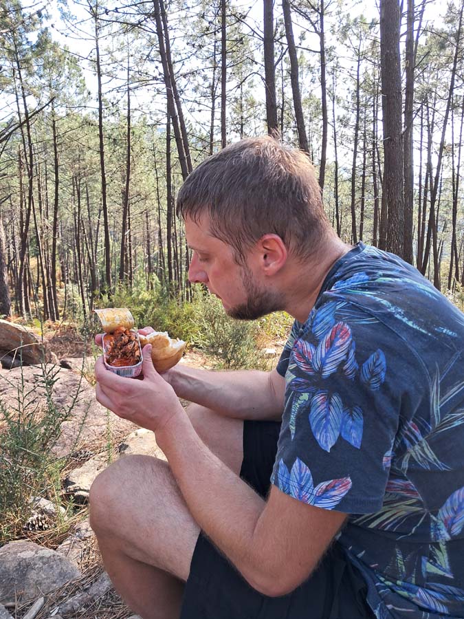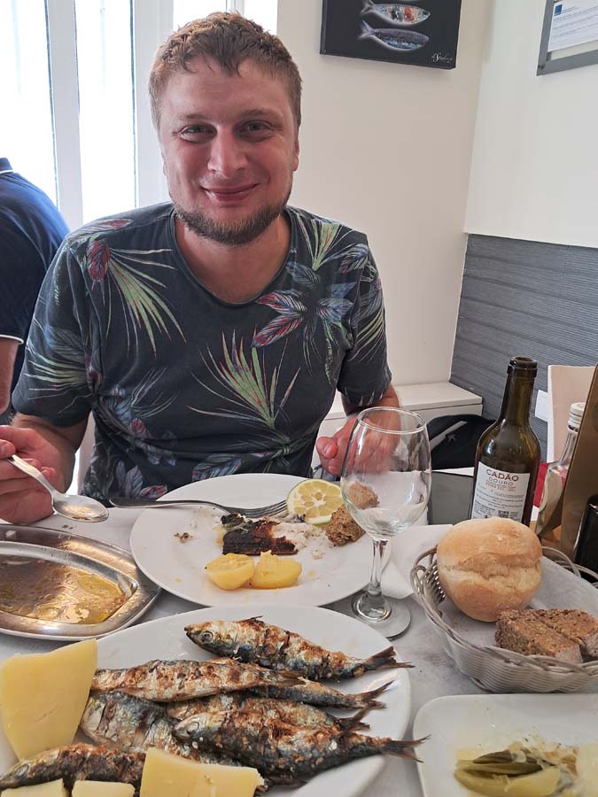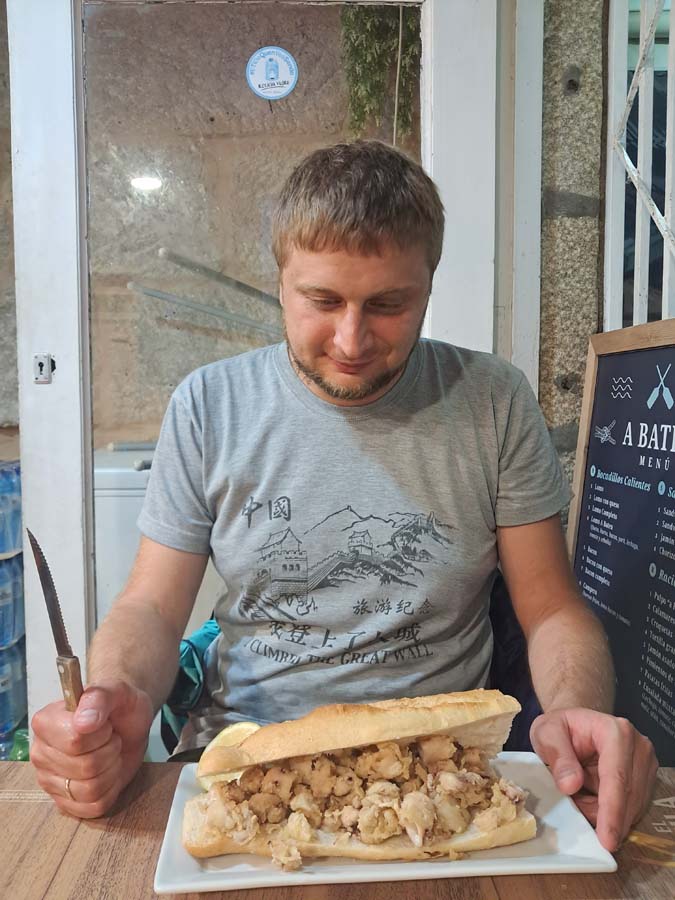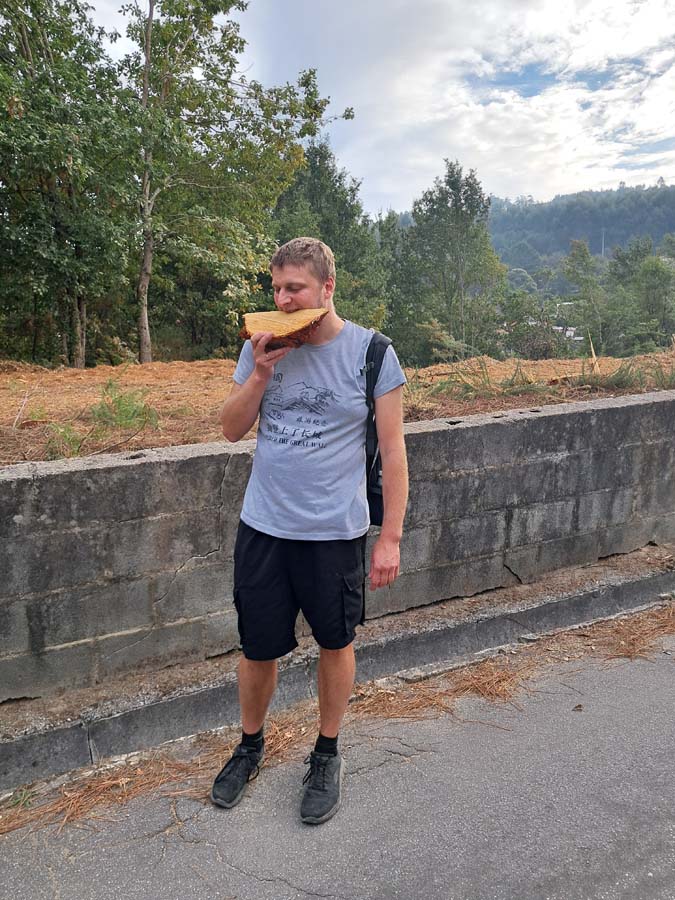 Почнемо нашу гастрономічну складову маршруту з рибки та вина. Загалом смак вина і шлях каміно це дві приємні речі, що йдуть в унісон з дня у день. Справа в тому, що на маршруті часто продаються комплексні обіди, в які входить півлітровий глечик вина на людину. Притому біле вино в цих закладах – напів ігристе. Минулого разу такі заклади у листопаді були переважно закриті, а на цей раз вже справжнє випробування. Бо після такого обіду ще може бути близько десяти кілометрів на маршруті. ШІ радив бути дуже обережним із вином на середині маршруту, але схоже це наше випробування, бо вино смачне, доведеться подолати! Тож в Португалії вино та сардини це справжні смаки каміно. Я ще все мріяв з’їсти традиційну франчезінью, але чомусь цей маршрут мав на мене інші плани.