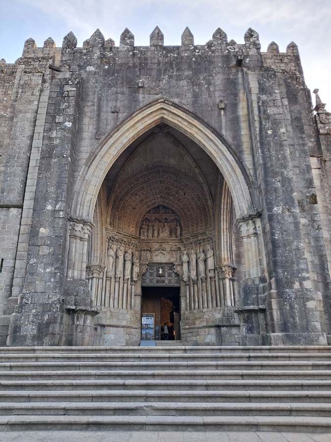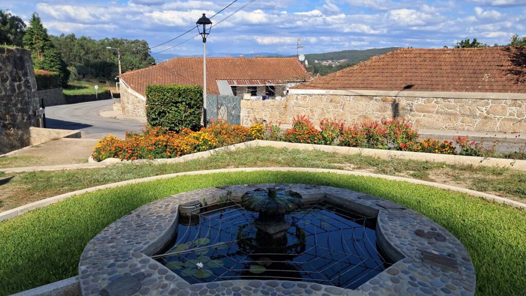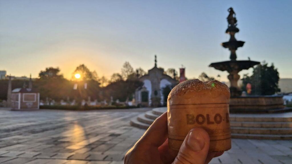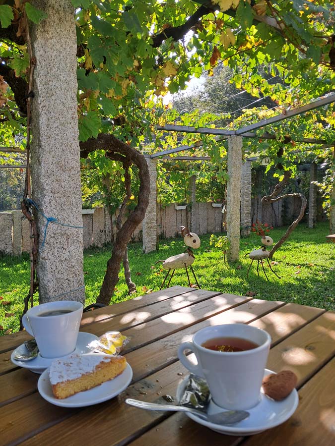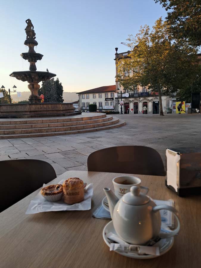 Нас зловила місцева жінка і вирішила нам провести справжню екскурсію! Шкода португальський діалект цього району був нам не зрозумілий. Але те, як захоплено і з інтонацією вона нам усе розповідала, вже вартувало отриманих емоцій. Вона нас навіть направила правильно пройти маршрут, так щоб додатково обійти церкву з гори і в гору. Ми хотіли пояснити, що ми там вже ходили, але жінка наполягала. Коли ми таки обійшли зайвий крюк, вона пройшла більш короткою дорогою і продовжила свою розповідь. Але важливий в цій історії саме фінал, вона нас завела в дуже затишну кав’ярню, пояснивши, що там можуть поставити пілігримський штамп. Тут було дійсно вау. Такс, влаштовуємо другий сніданок на терасі з видом на фонтан і площу.