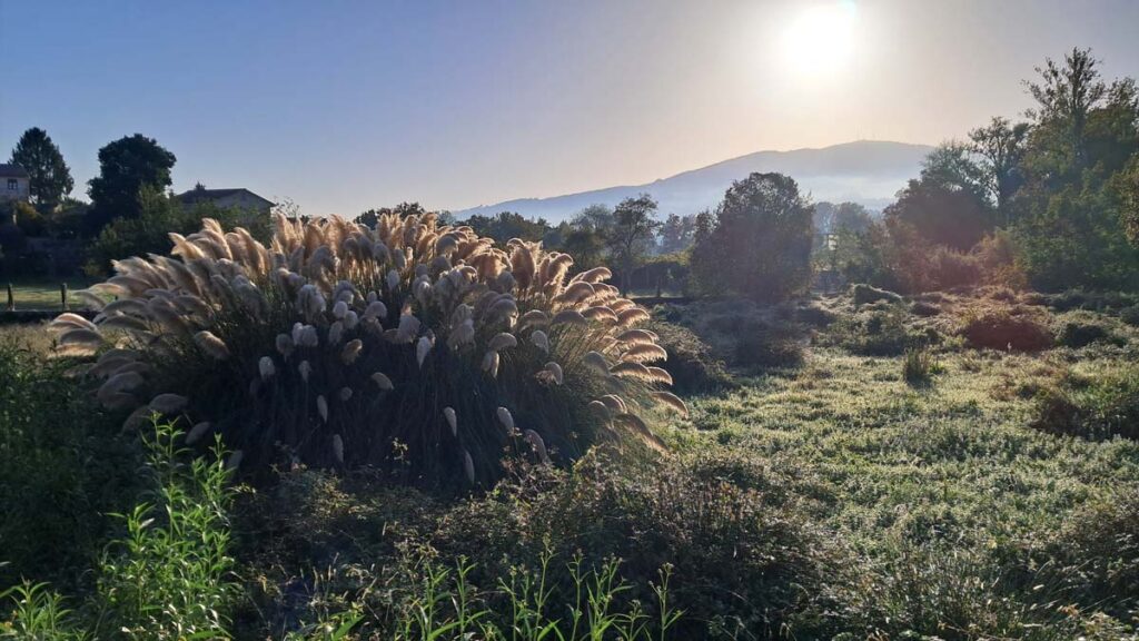 Яскраві жовті квіти супроводжували наш ще сонячний день. Як прокоментувала Аня по фото – це отруйні квіти. Дякуємо Аня, тепер увесь залишок маршруту, коли ми бачили ці красиві квіти, то обов’язково між собою жартома нагадували, що вони отруйні до речі))) Сьогодні ми вийшли на перетин маршруту із попереднім каміно і почали проходити знакові для себе місця. Було радісно пройти біля готелю, де було стільки приємних спогадів, як ми смажили свіжу рибку, про те як ми дивилися за життям тваринок на березі річки. І про кущ, який замість панорами нам сфотографував пілігрим, коли ми його попросили зробити нам панорамне фото. До речі, кущ підріс з того часу.