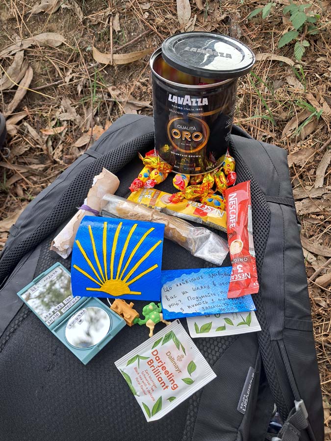 А далі на нас чекало місце серед лісу, де нам Аня з Віктором залишили секретний пакунок, коли проходили своє каміно. У нас була відеоінструкція, де приблизно його треба шукати. Ніколи не подумав би, що в середині пенька може бути стільки місця. То була велика кавова банка, в середині якої були цікаві завдання і справжні скарби у вигляді українських цукерок, ще й гроші за які ми пізніше радісно відсвяткуємо фінал маршруту.